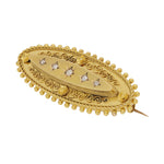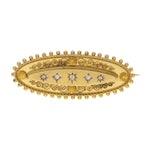 This antique brooch is set in yellow gold and formed in an elongated oval shape. The centre panel is set with five small old cut diamonds, each star set and evenly spaced along the length of the brooch.
