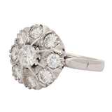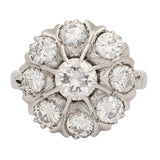 A dazzling vintage cluster ring centred on a brilliant-cut diamond, encircled by a radiant halo of matching diamonds in a beautifully balanced floral formation.