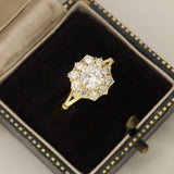 A sparkly vintage cushion cut diamond cluster ring set in 18k gold.