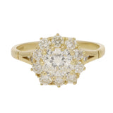 This 18ct yellow gold ring central features a cushion cut diamond, secured in a classic ten claw setting. Surrounding the centre stone is a full cluster of ten round brilliant cut diamonds arranged in a soft, rounded halo. Each diamond is individually claw set, allowing excellent light return and sparkle. The cluster leads into a tapered yellow gold band with a subtle split shoulder detail the features a rubover set diamond that beautifully frames the head of the ring.