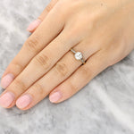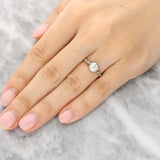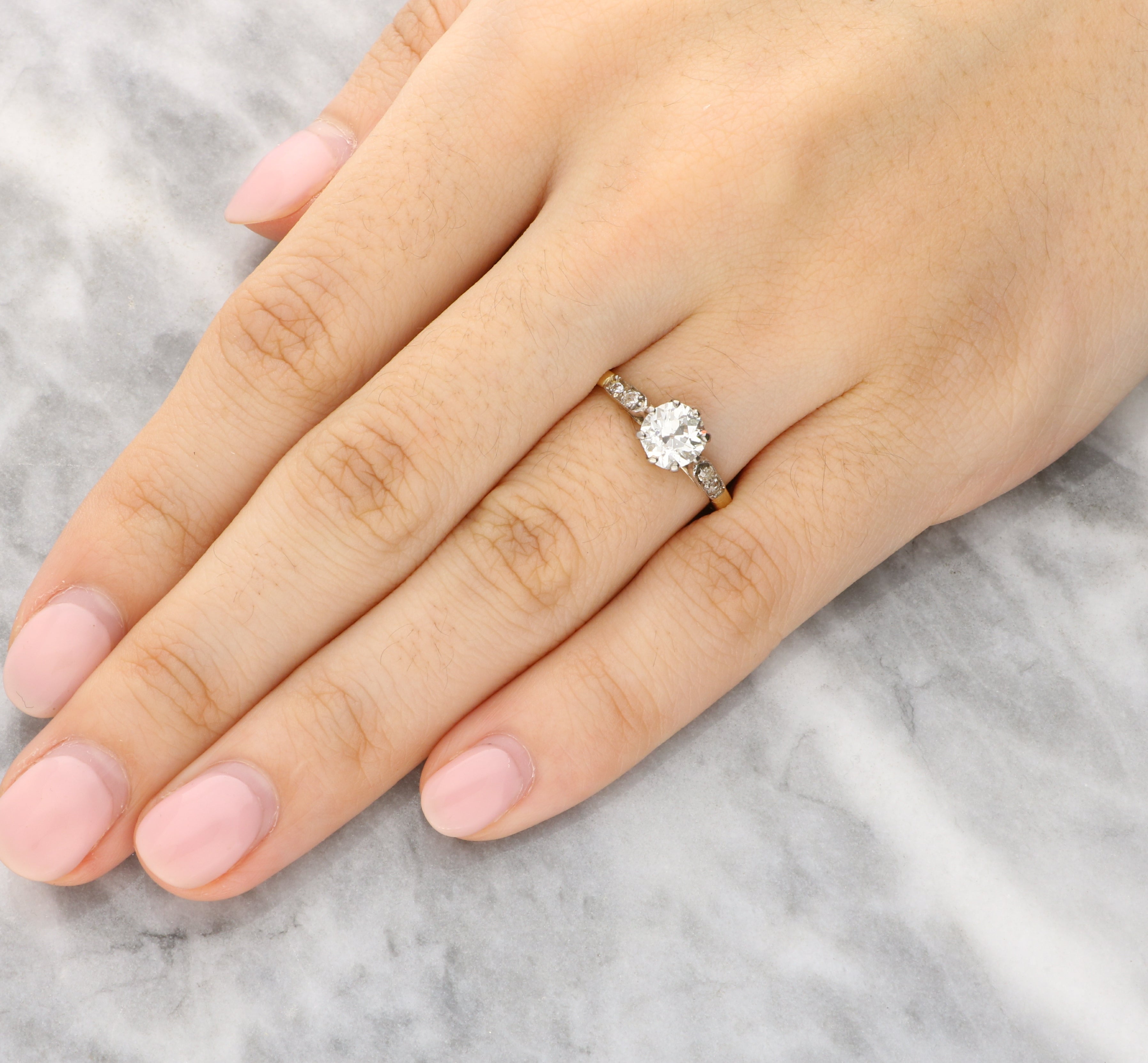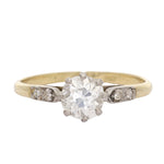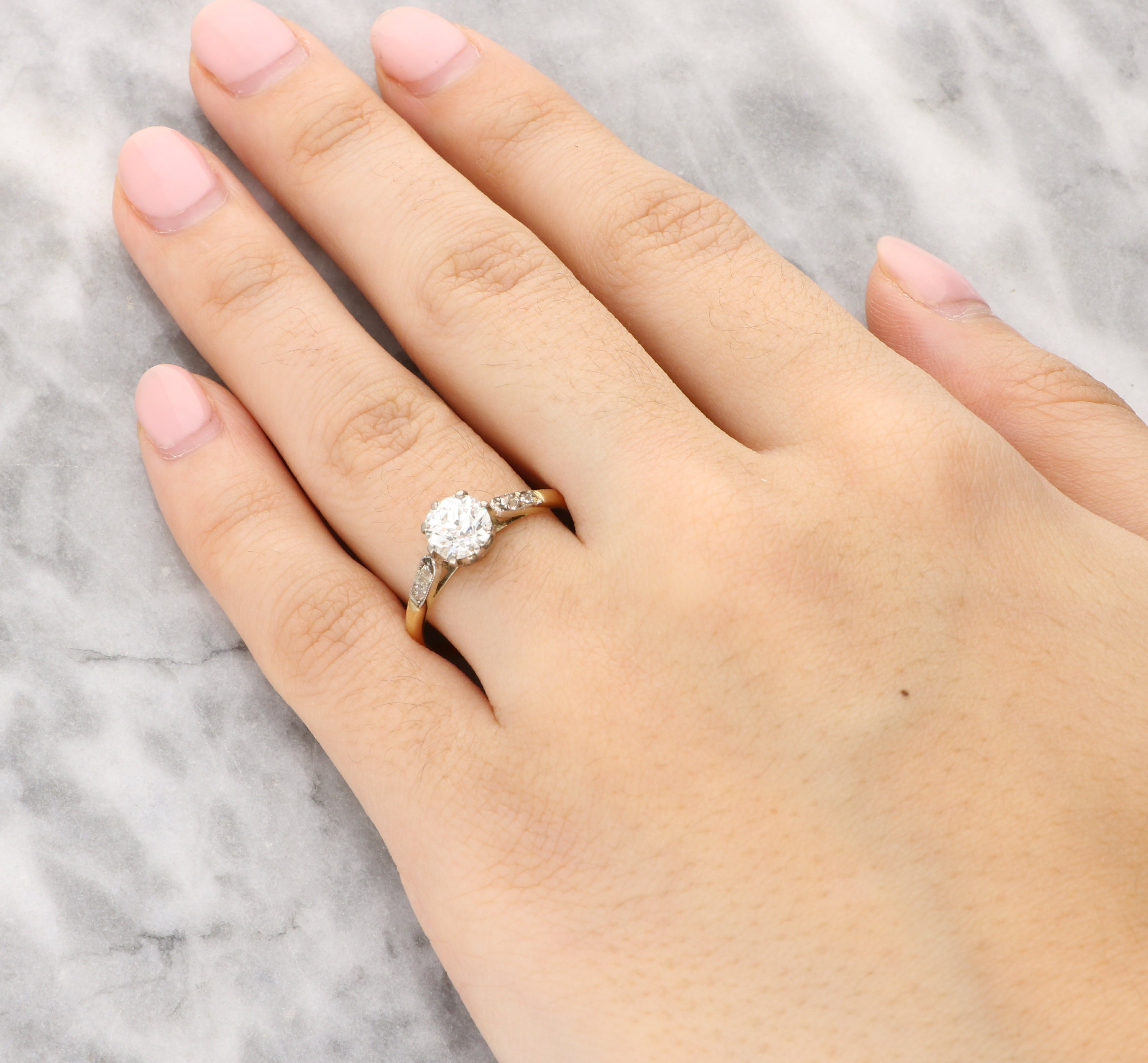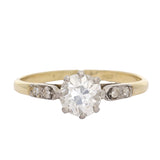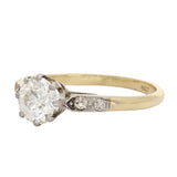 Each shoulder is accented with two old cut diamonds that contrast softly against the yellow gold band. The combination of two-tone metal enhances the brightness of the diamonds while adding subtle vintage character.