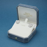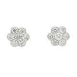 Each earring is centrally set with a sparkling claw set round cut diamond, surrounded by a cluster of six round cut diamonds. The elegant bezel setting creates a charming scalloped edge, giving the earrings their classic floral inspired appearance. They are secured at the back with a post and butterfly fitting.