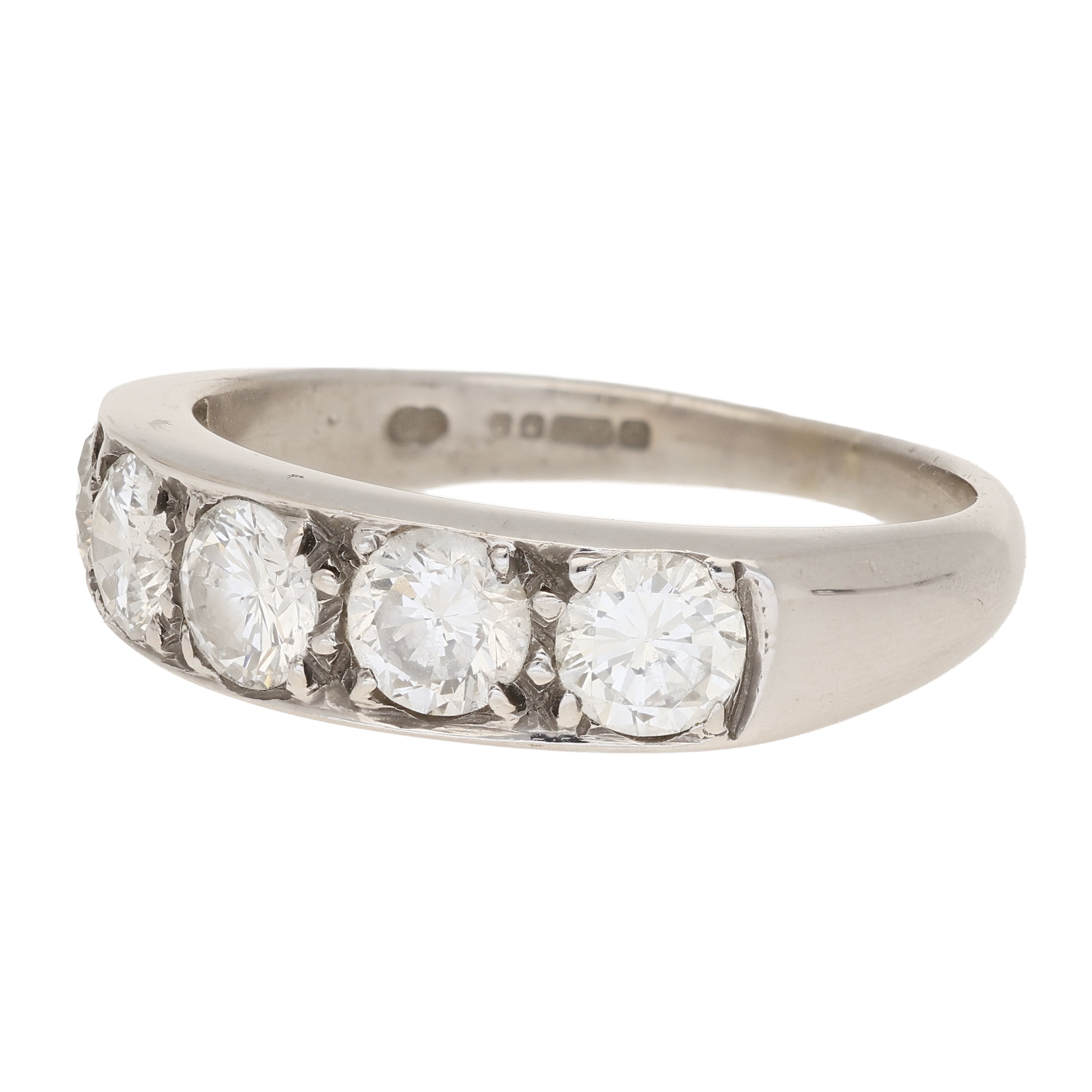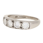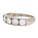 This vintage five stone diamond ring is set in 18ct white gold. The diamonds are round brilliant cut and securely channel set. The head of the ring leads to a solid white gold band.
