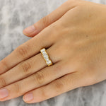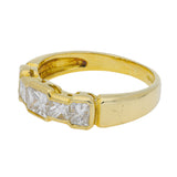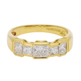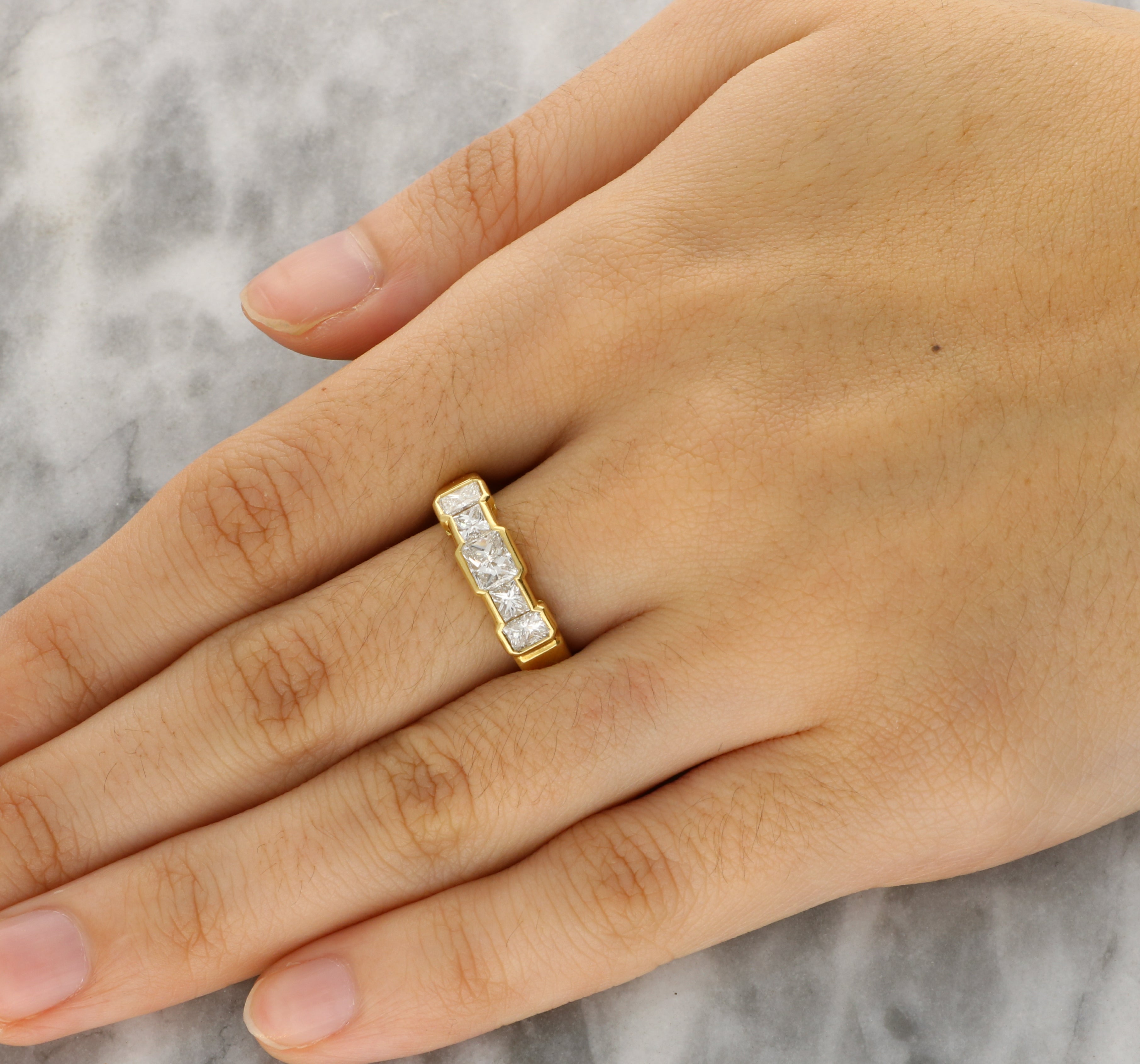 This classic ring is crafted in 18K yellow gold and features a row of five square-cut diamonds, graduating subtly toward a larger central stone. The geometric lines of the diamonds create a refined and timeless look, beautifully complemented by the warm gold setting.
