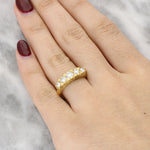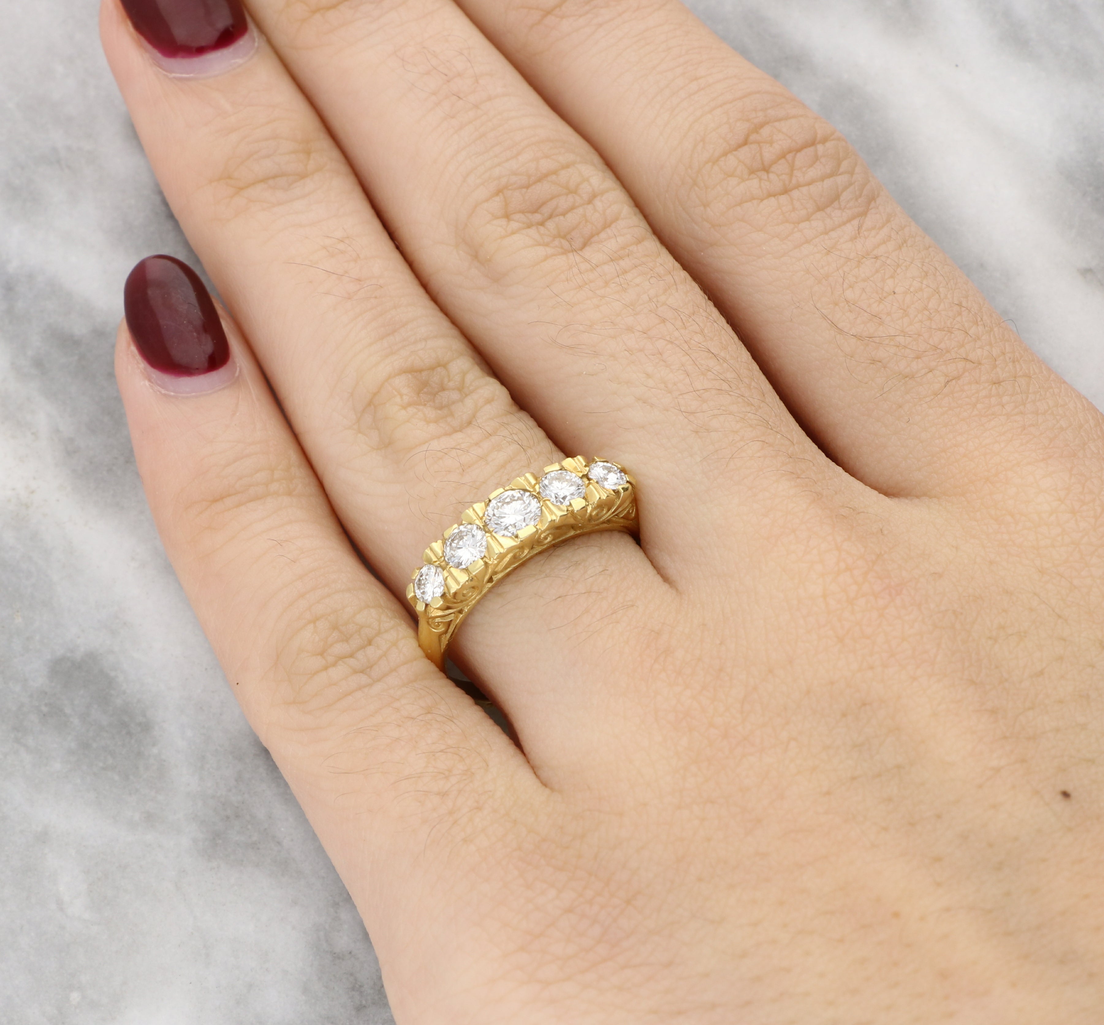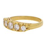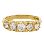 This classic ring features five round brilliant-cut diamonds, beautifully graduated across the finger to create a beautiful silhouette. The warm 18K yellow gold mount provides a rich contrast to the bright white diamonds, while the traditional setting style gives the piece a timeless appeal.