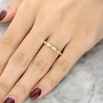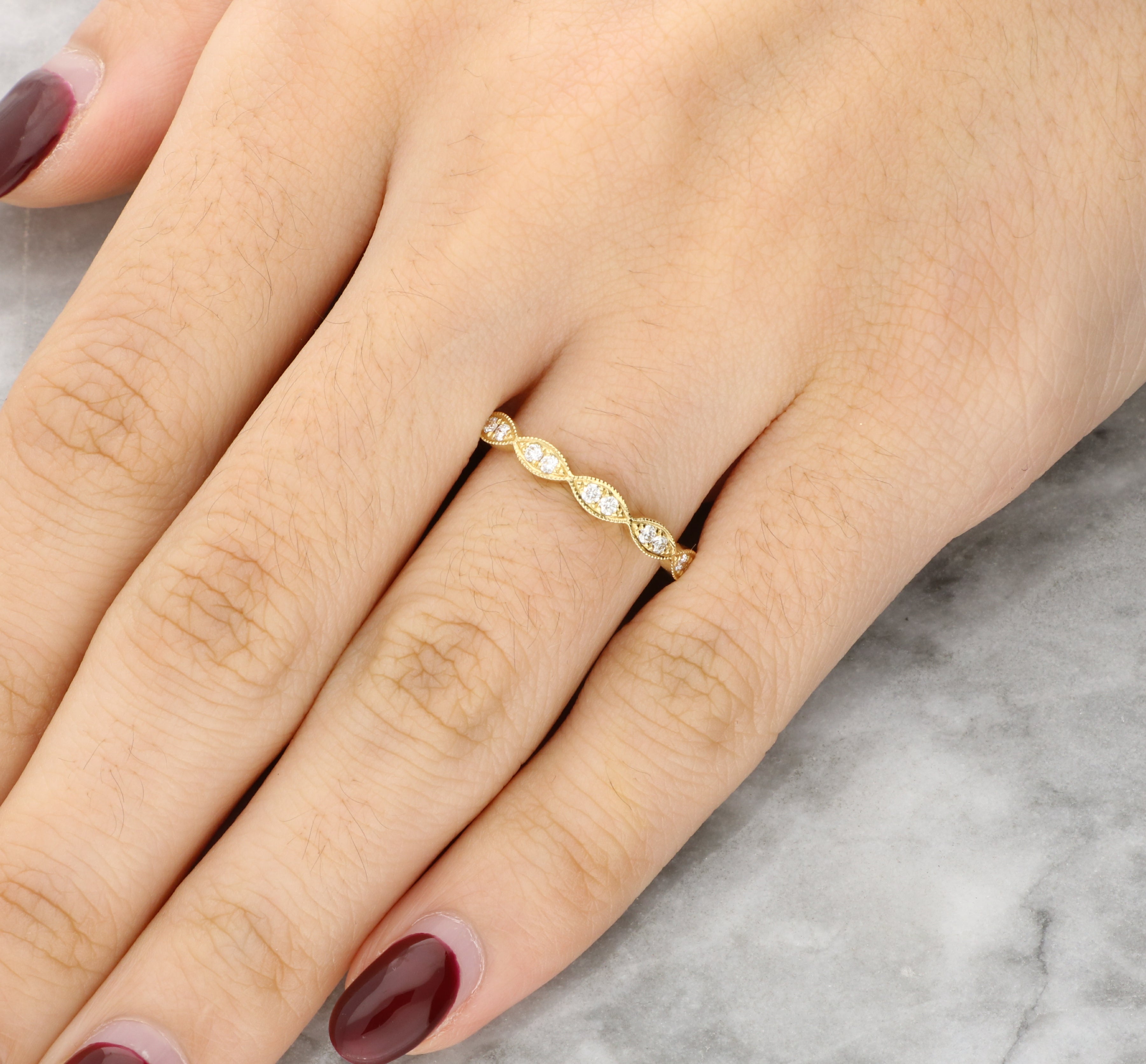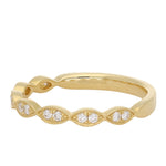 This ring is set in yellow gold and features a series of round brilliant cut diamonds arranged across the front of the band. The diamonds are grouped in pairs and set within marquise shaped settings, creating a flowing, repeating pattern along the top of the ring.