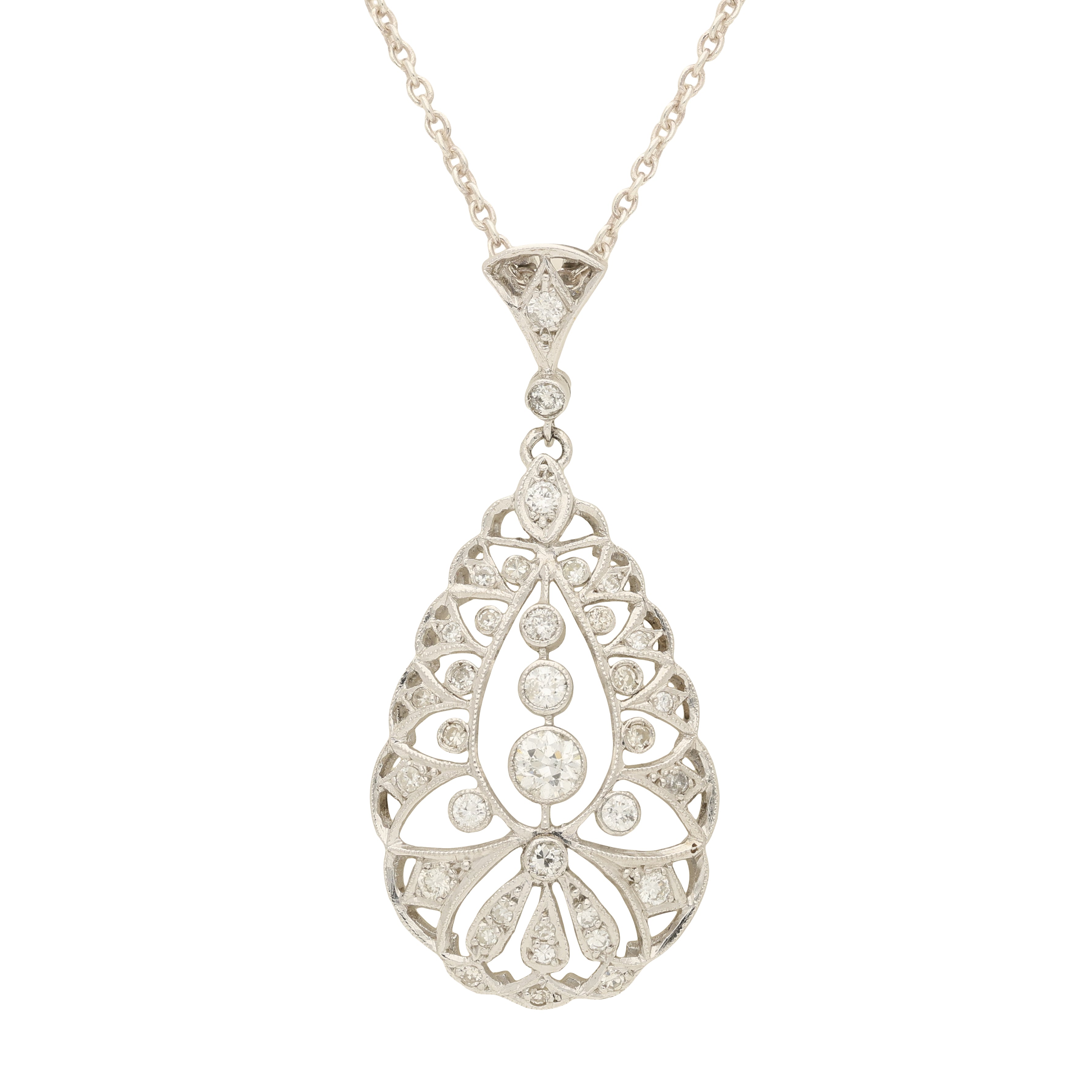 This elegant pendant is crafted in platinum and designed in a graceful openwork drop form. The centre is set with a vertical line of round cut diamonds, graduating in size and drawing the eye down through the design. Surrounding this are delicate pierced scroll and lattice details, each accented with additional diamonds that add light and sparkle from every angle.