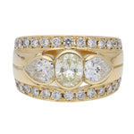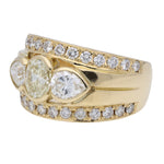 This ring is set in yellow gold and features a central oval cut yellow diamond, with two pear cut diamonds on each side.