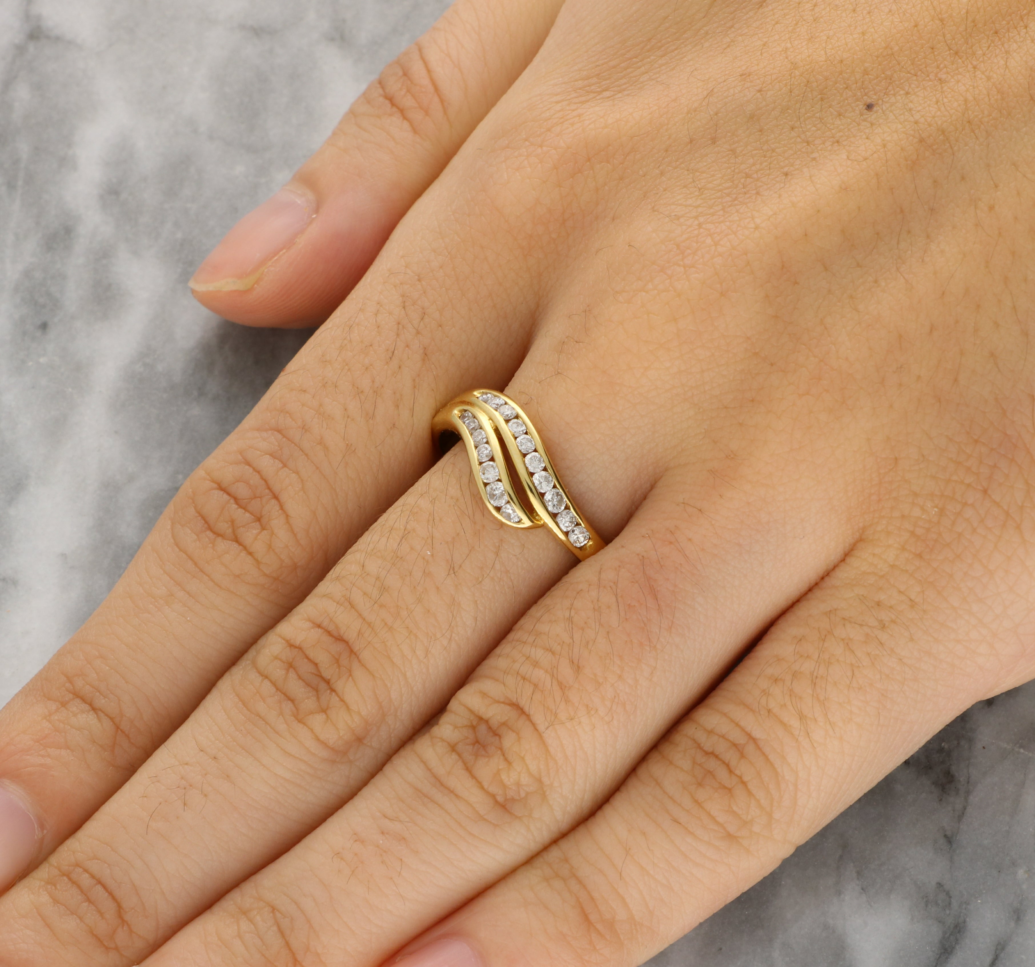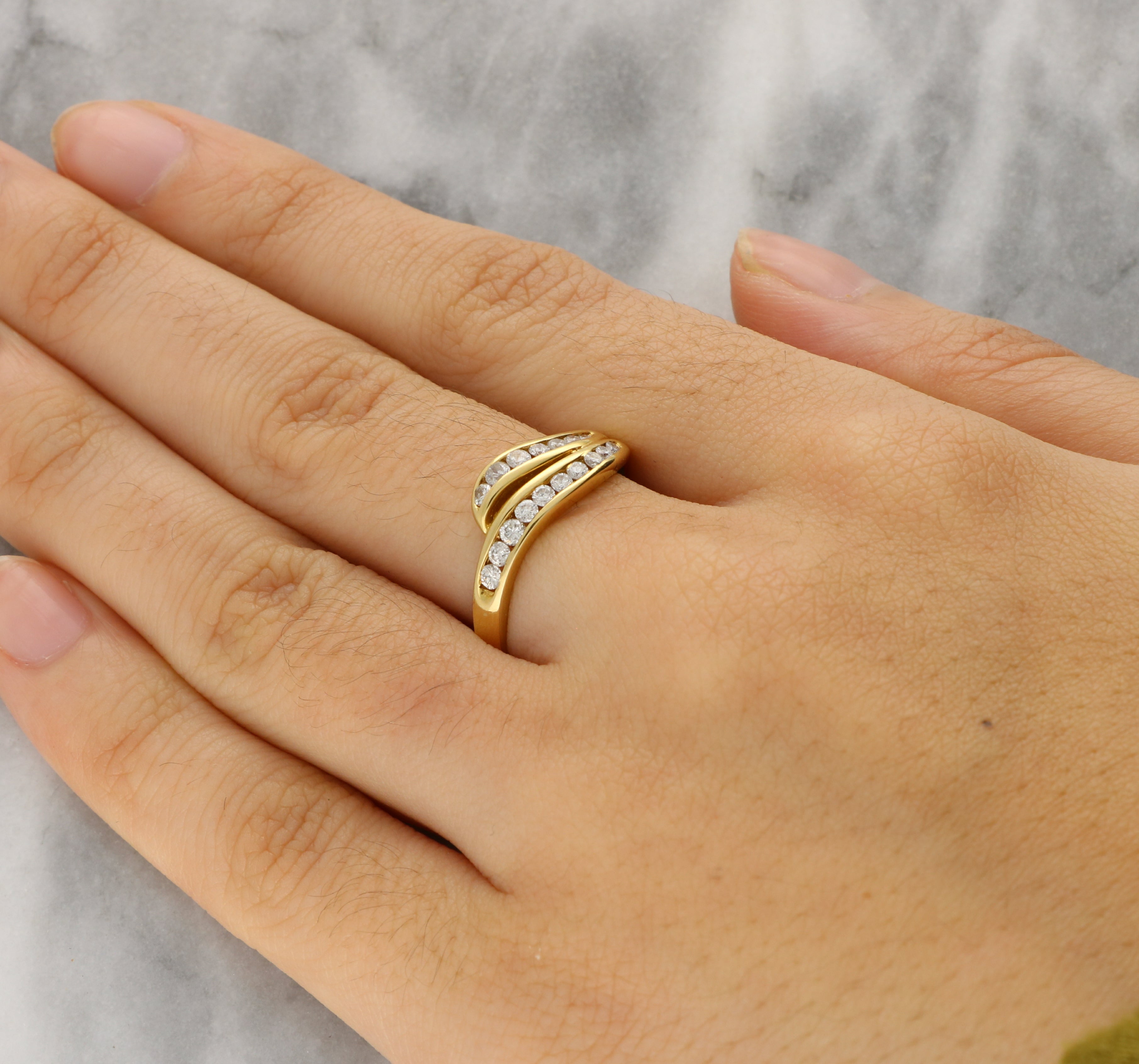 This diamond crossover ring is perfect worn alone as a modern statement or stacked with other bands for a layered, contemporary look.