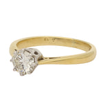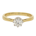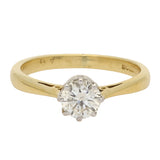 This lovely ring is centred on a beautiful round brilliant-cut diamond, secured in a classic six-claw white gold setting. The open mount allows light to flow through the stone, enhancing its natural fire and sparkle. The warm 18K yellow gold band gently tapers towards the centre, while subtle open detailing at the shoulders adds a refined touch of craftsmanship.