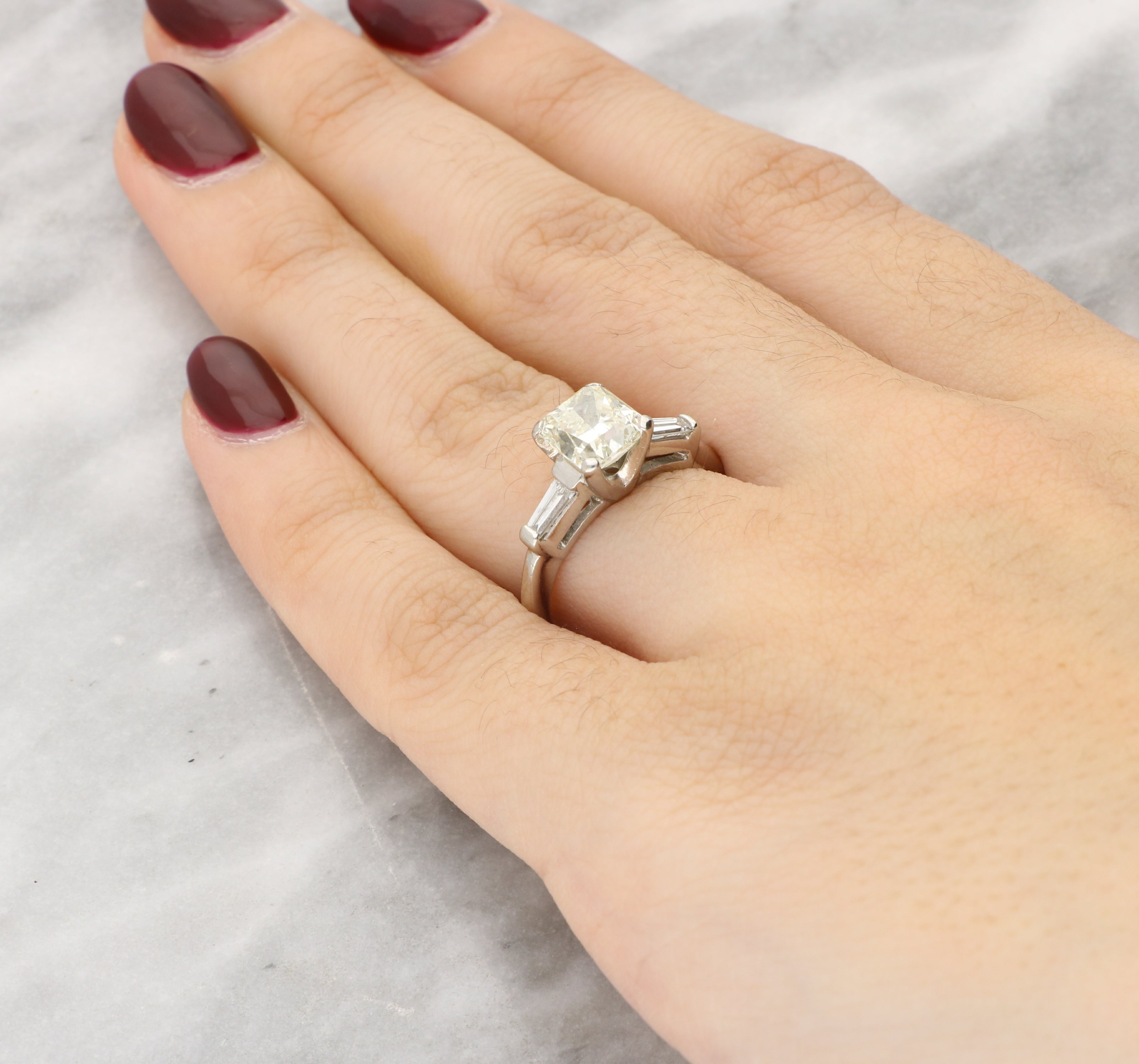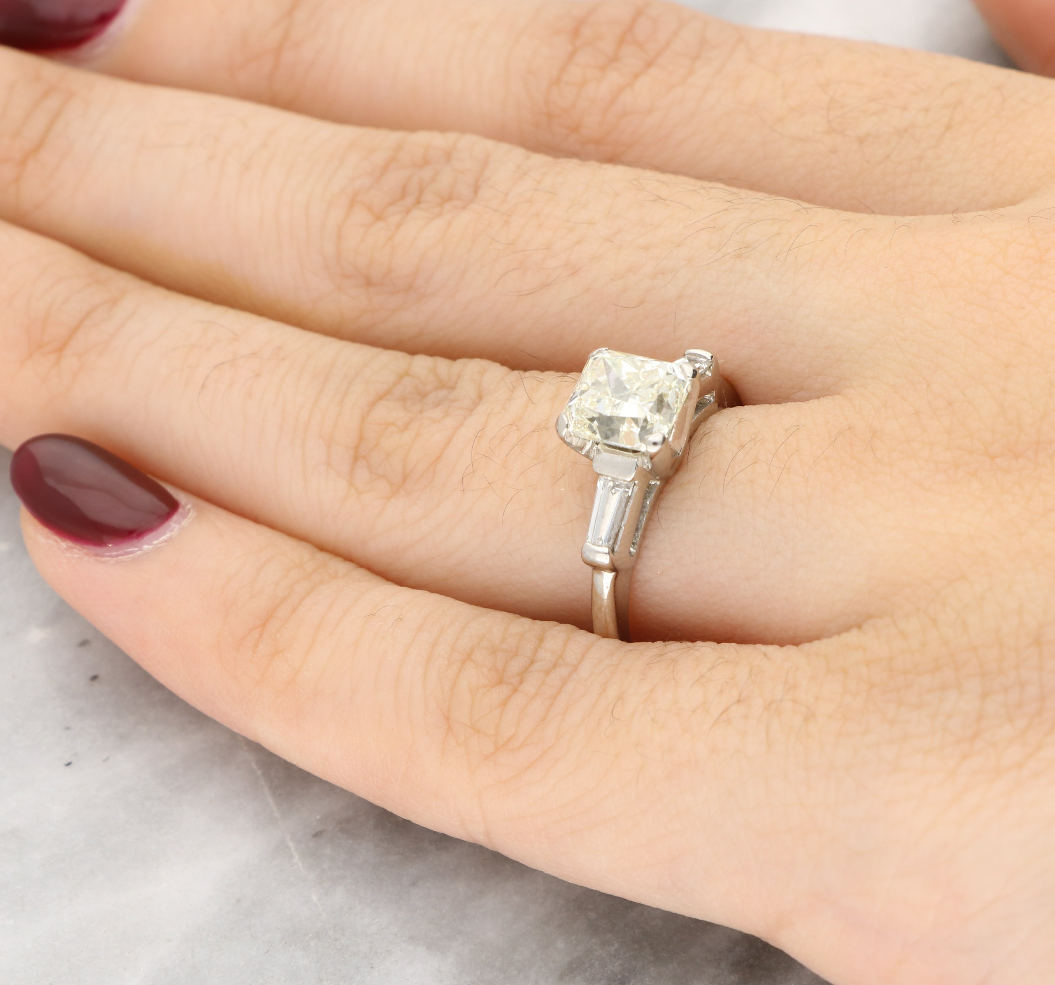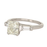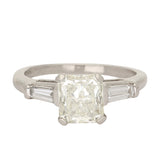 This gorgeous ring features a centrally set radiant cut diamond secured in a classic four claw setting. The centre stone is flanked by two tapered baguette cut diamonds, drawing the eye inward and enhancing the brilliance of the main diamond.
