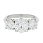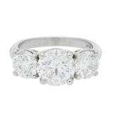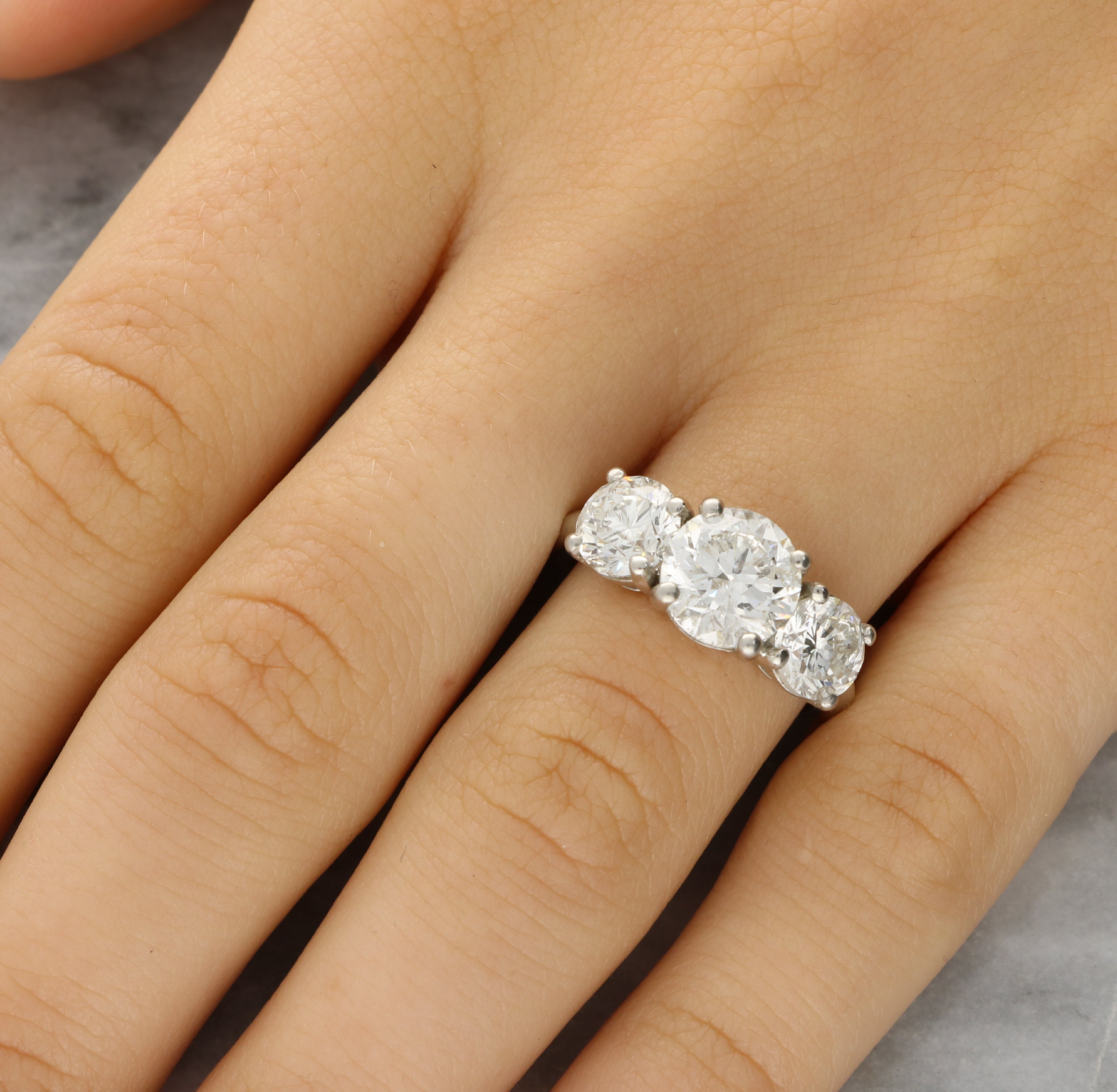 The ring features a central round cut diamond, securely four claw set, flanked by a round cut diamond on each side, also four claw set. The head of the ring leads to a solid platinum band.