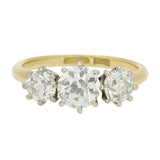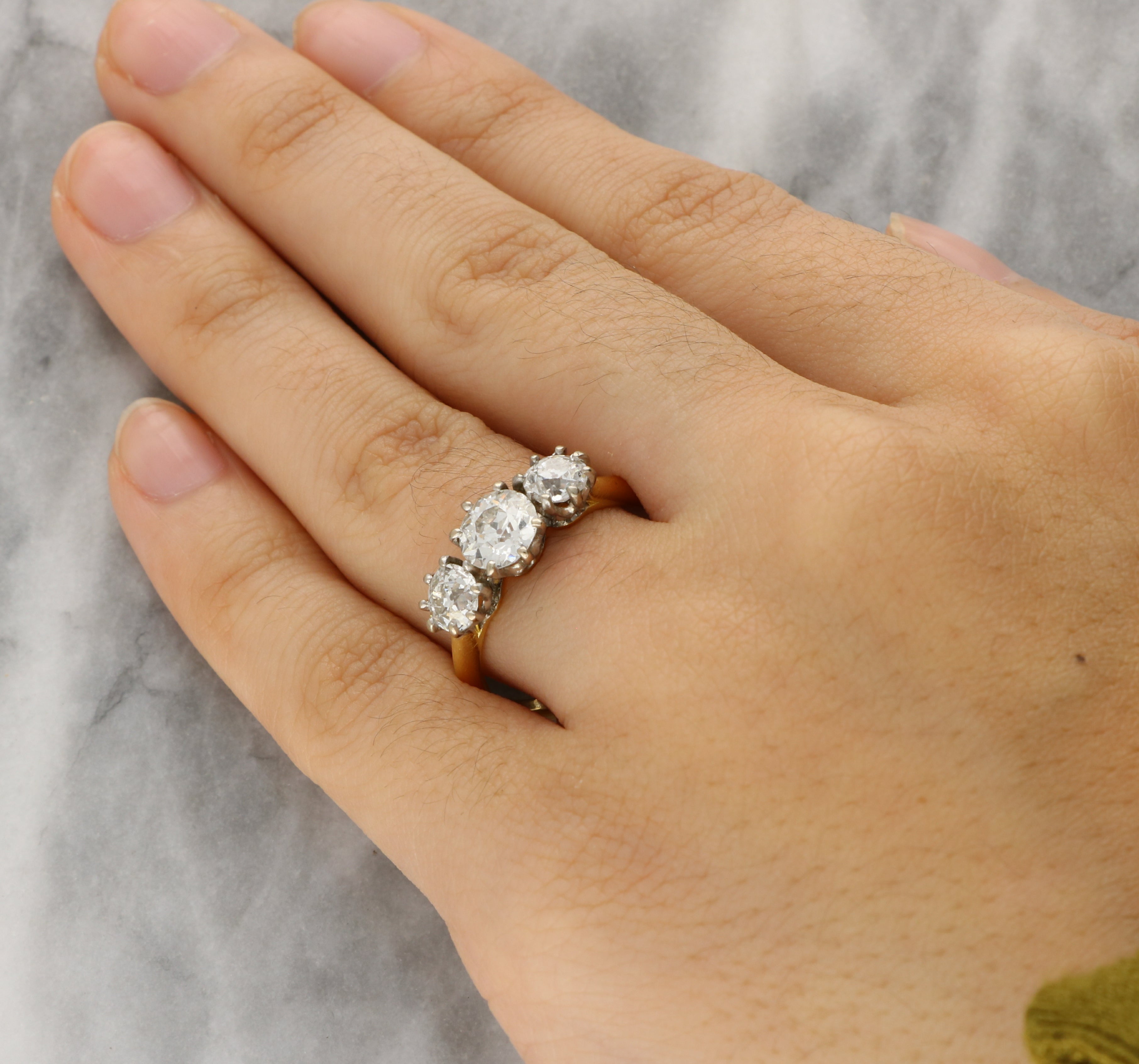 This vintage three stone ring is set in 18 carat gold with a larger central stone flanked by two slightly smaller diamonds on either side. Each old-cut diamond is secured in a classic claw setting with a graduated arrangement that creates an elegant profile across the finger.