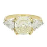 The ring is set with a cushion cut diamond at the centre, held in 18ct yellow gold claws that frame the stone and highlight its soft, warm tone. To either side sits a pear cut diamond, each set in white gold claws to create contrast and draw focus to the central stone.