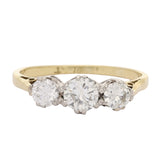 A beautifully balanced vintage ring set with three brilliant-cut diamonds, the centre stone slightly larger and flanked by two perfectly matched companions. The trio is arranged in a classic graduated formation, allowing each diamond to catch the light with lively sparkle and fire.