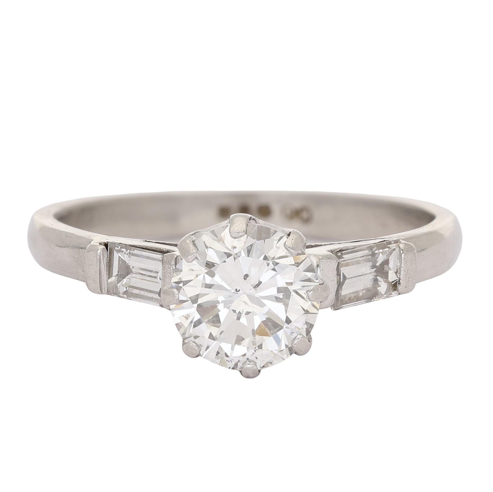 Flanking the centre diamond are tapered baguette-cut diamonds, channel-set into the shoulders for a sleek and sophisticated finish. Their linear facets create a striking contrast to the round centre stone.