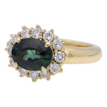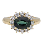 The ring centrally features an east west set deep green oval cut tourmaline securely four claw set in 18ct yellow gold. The tourmaline surrounded by a cluster of twelve round brilliant cut diamonds. The head of the ring leads to a solid 18ct gold band.