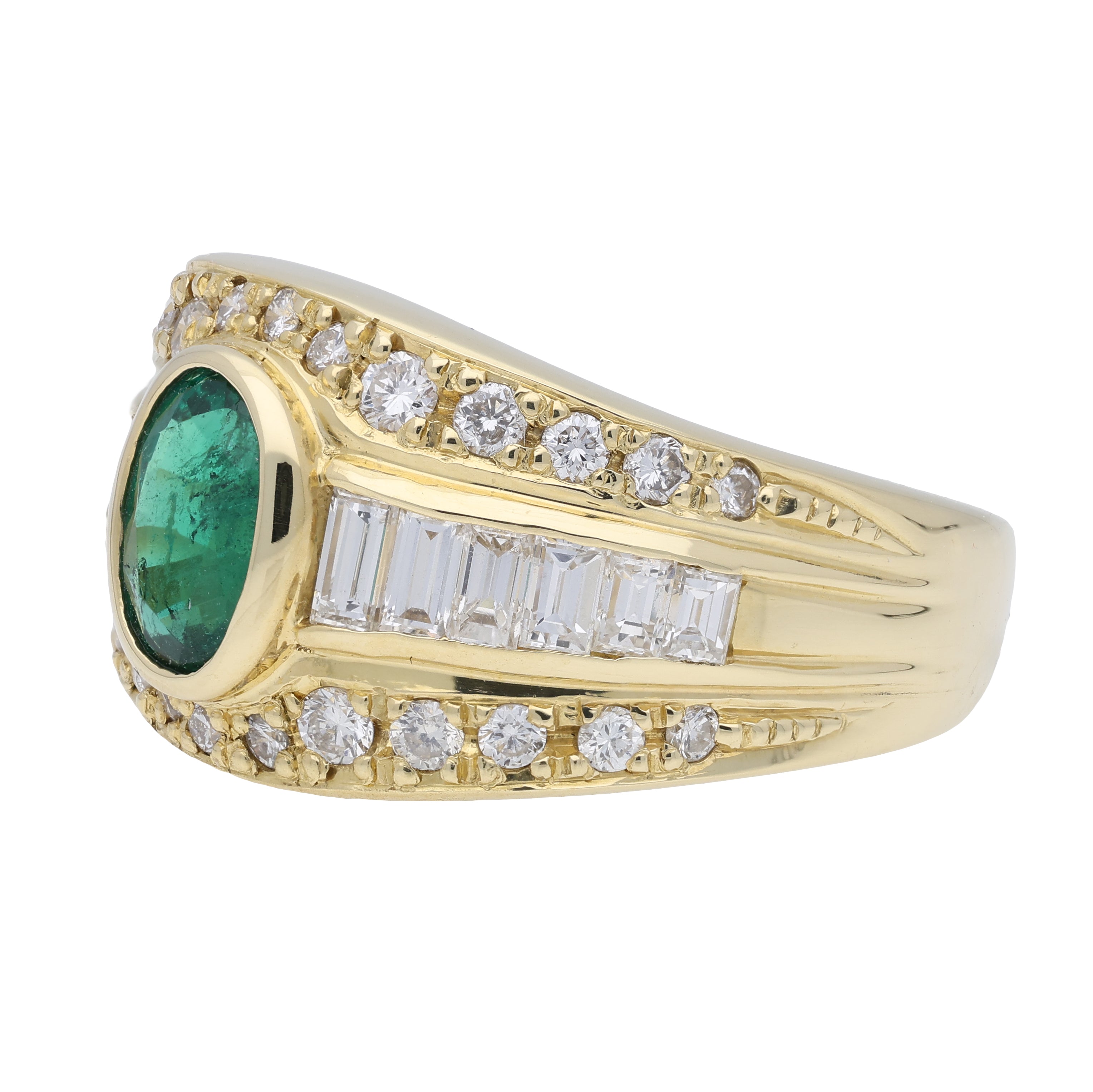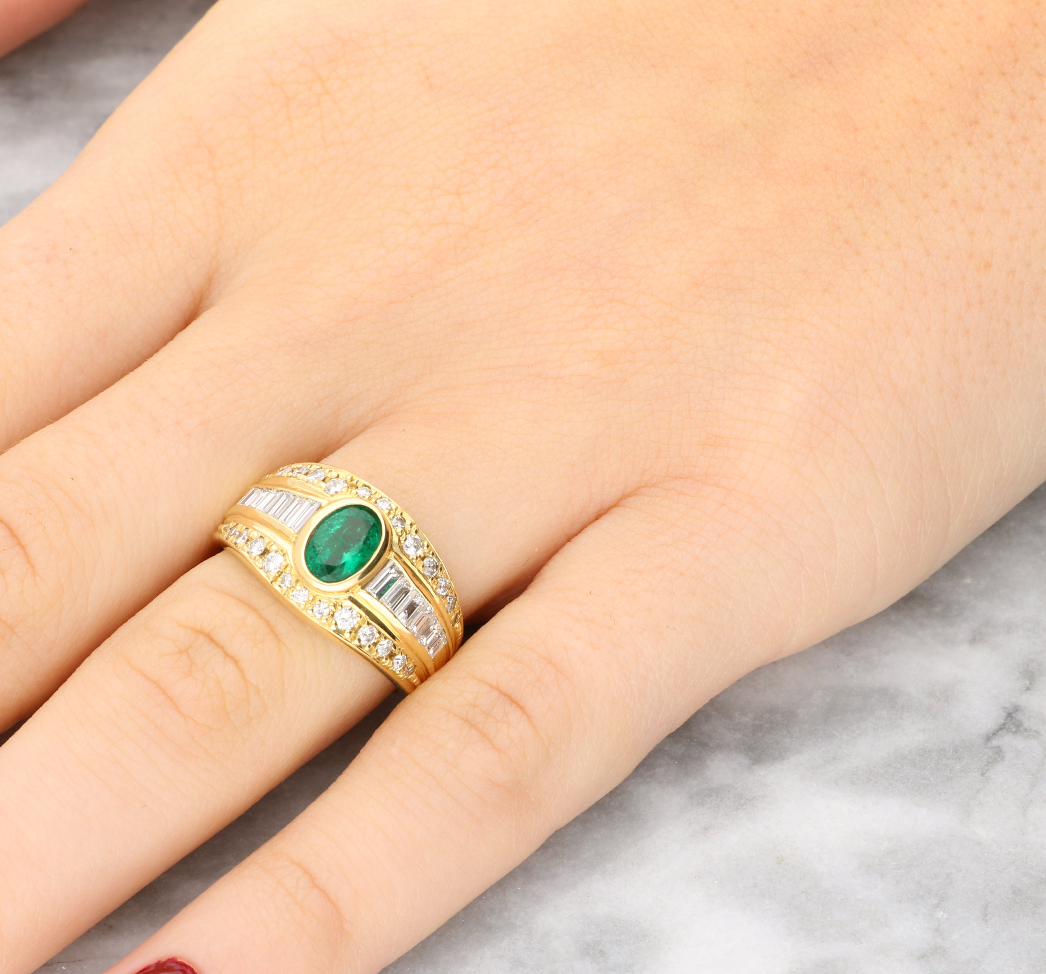 This beautiful vintage ring features a vibrant oval cut emerald, securely bezel set at its centre. The emerald is surrounded by sixteen round brilliant cut diamonds and six baguette cut diamonds graduating in size. The head of the ring leads to solid chunky gold band.