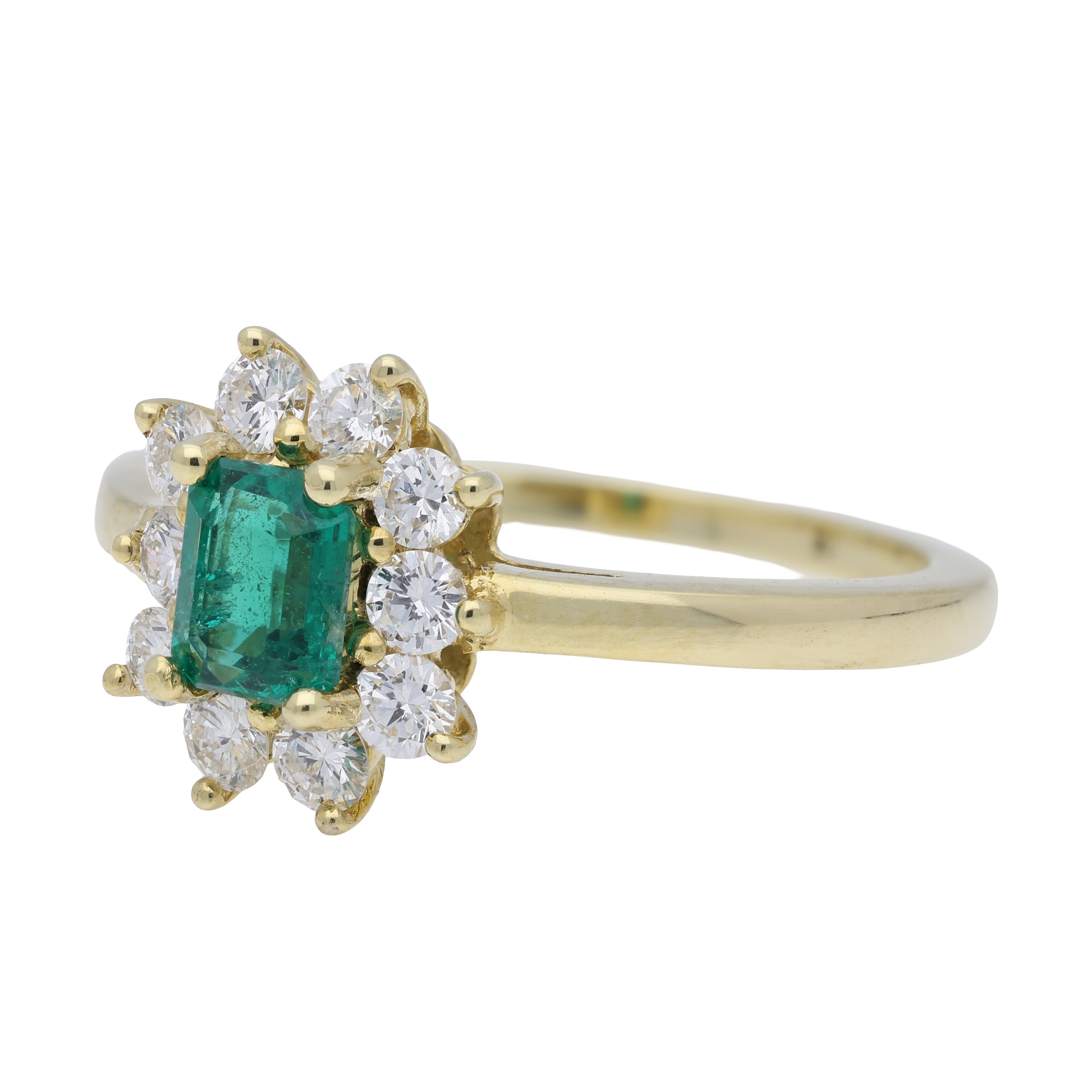 This beautiful vintage ring features a vibrant emerald cut emerald, securely four claw set. The emerald is surrounded by a cluster of ten round cut diamonds which are claw set. The head of the ring leads to a solid yellow gold band.