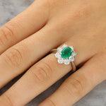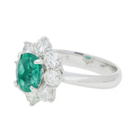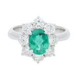 The ring features a vibrant green oval cut emerald which is securely four claw set at the centre of a classic cluster design. Surrounding the emerald are eight round brilliant cut diamonds, each claw set to frame the central stone beautifully. The head of the ring leads to a solid, tapered platinum.