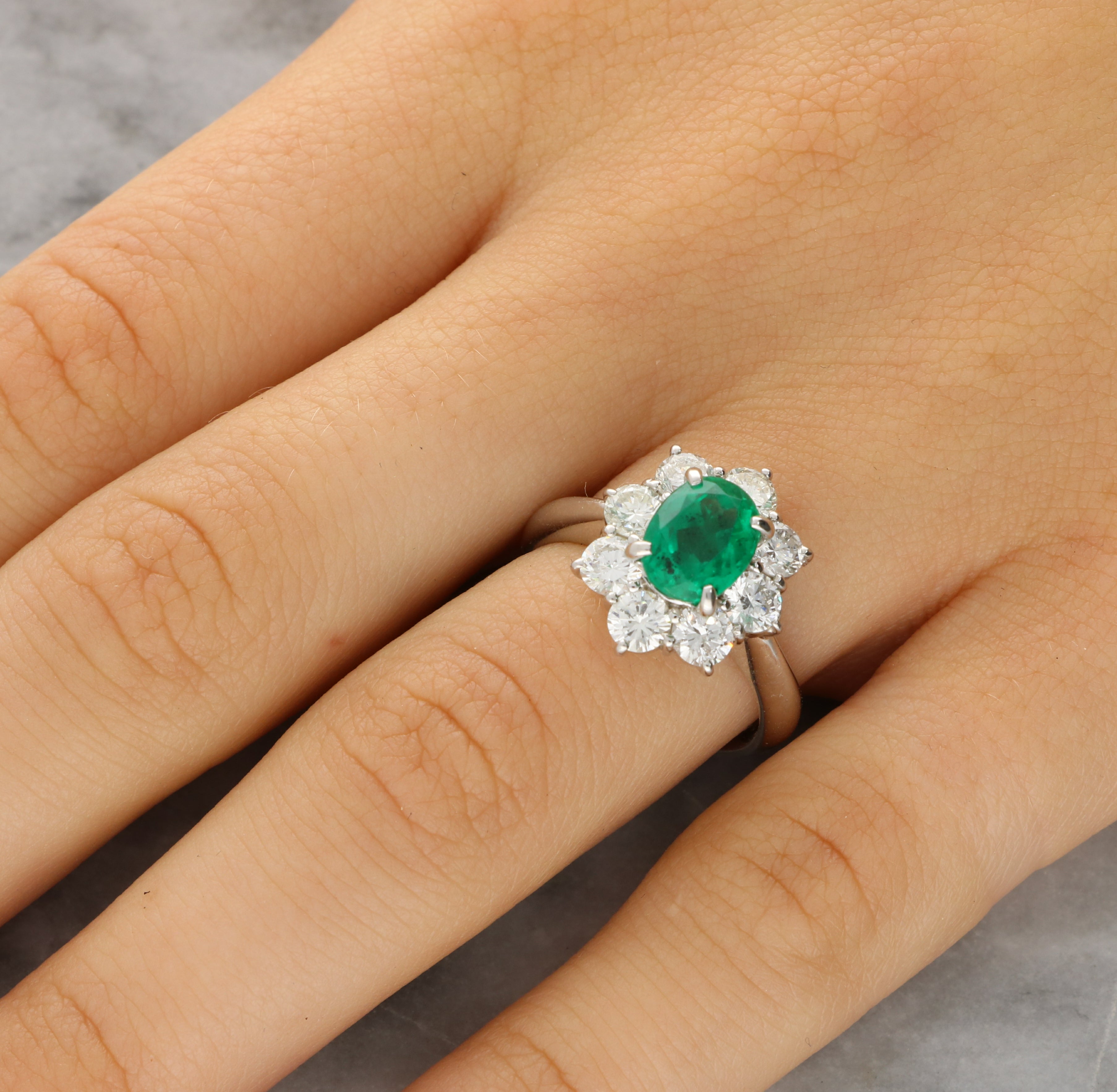 A vintage emerald and diamond cluster ring set in platinum.