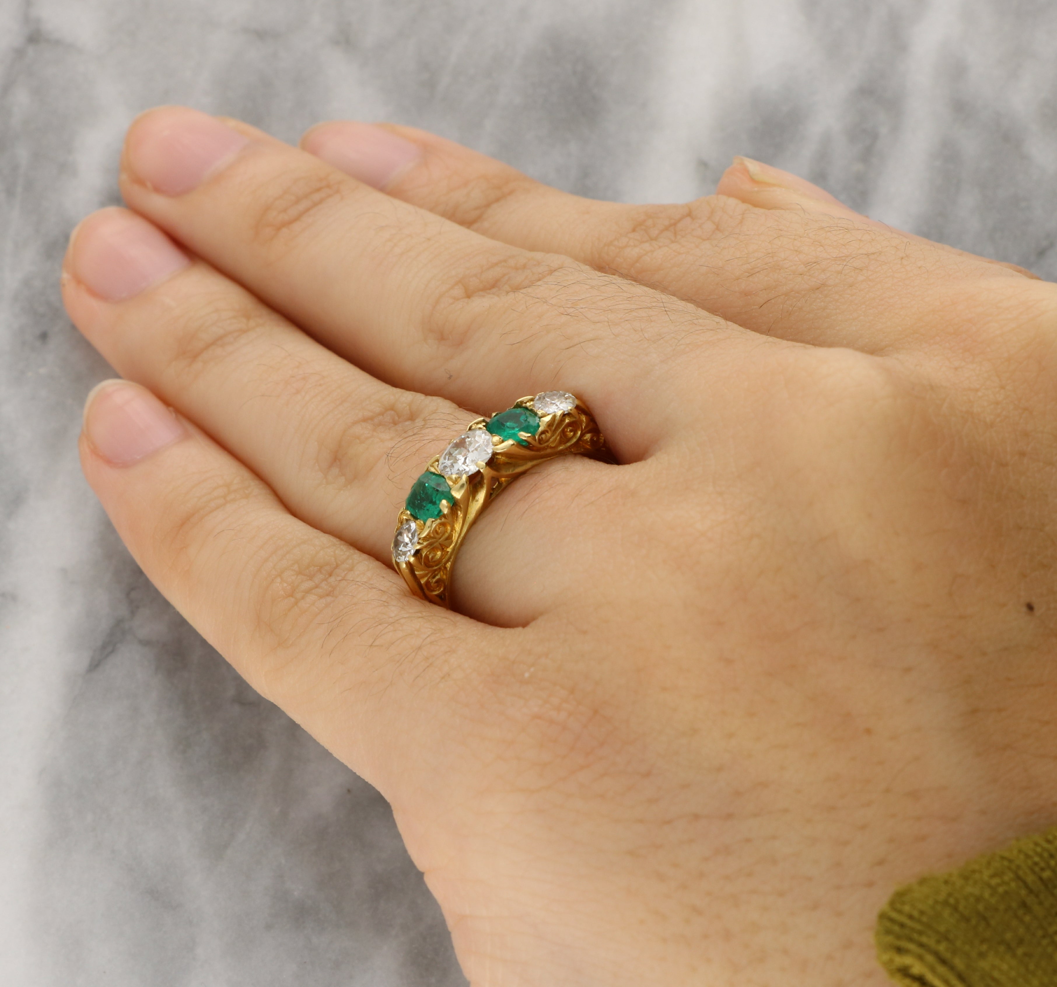 The emeralds display vivid green tones, contrasting beautifully with the soft brilliance of the old-cut diamonds. The gold shank is also beautifully enhanced with ornate engraved scrollwork along the shoulders, adding depth and character to the design.