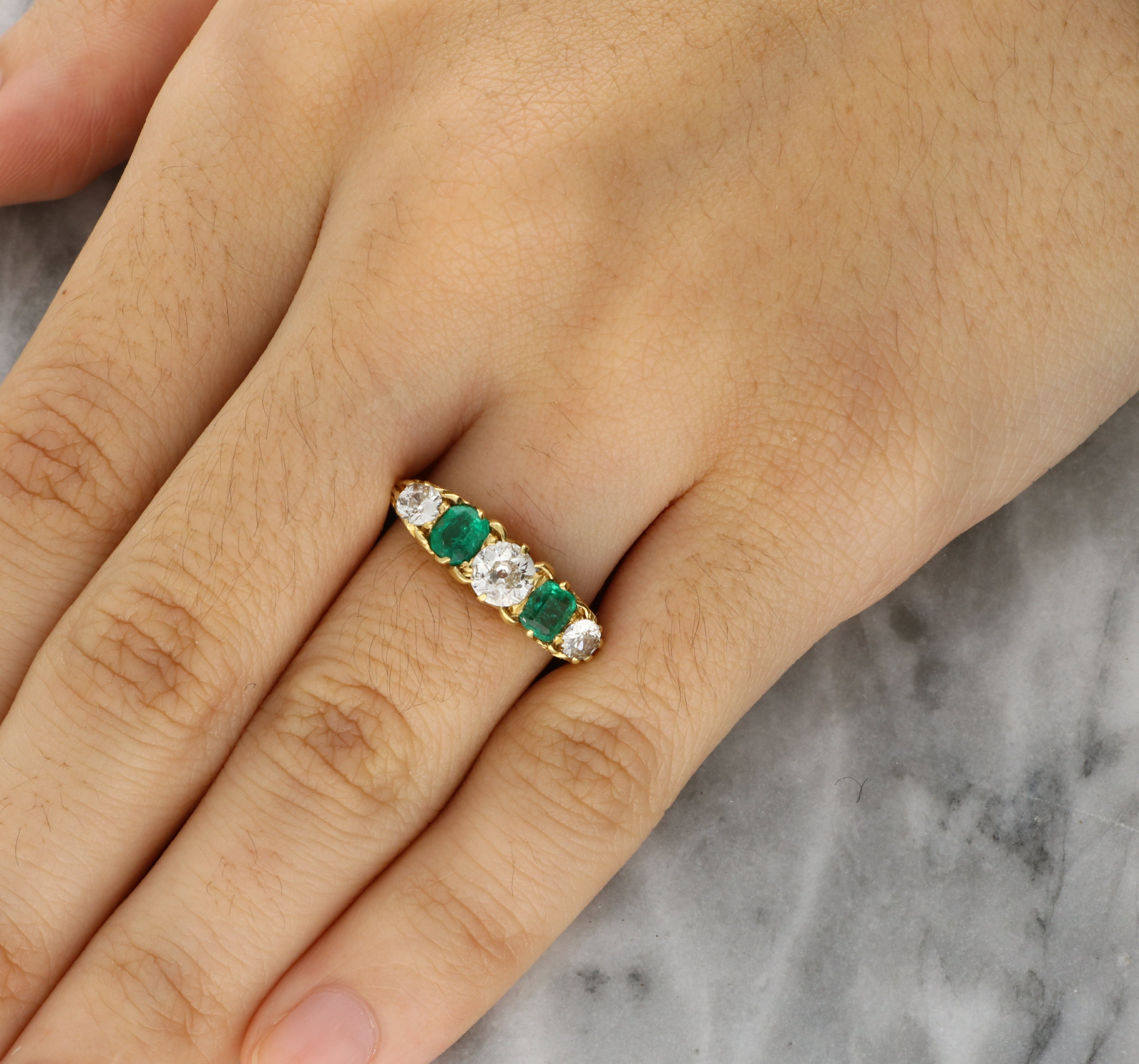 This elegant ring is crafted in 18K yellow gold and features a classic five-stone arrangement of alternating emeralds and diamonds, a design long associated with love and important life milestones. At the centre sits an old-cut diamond, flanked on either side by richly coloured cushion-cut emeralds and further old-cut diamonds, creating a harmonious and well-balanced composition typical of late Victorian and Edwardian jewellery.