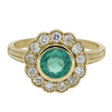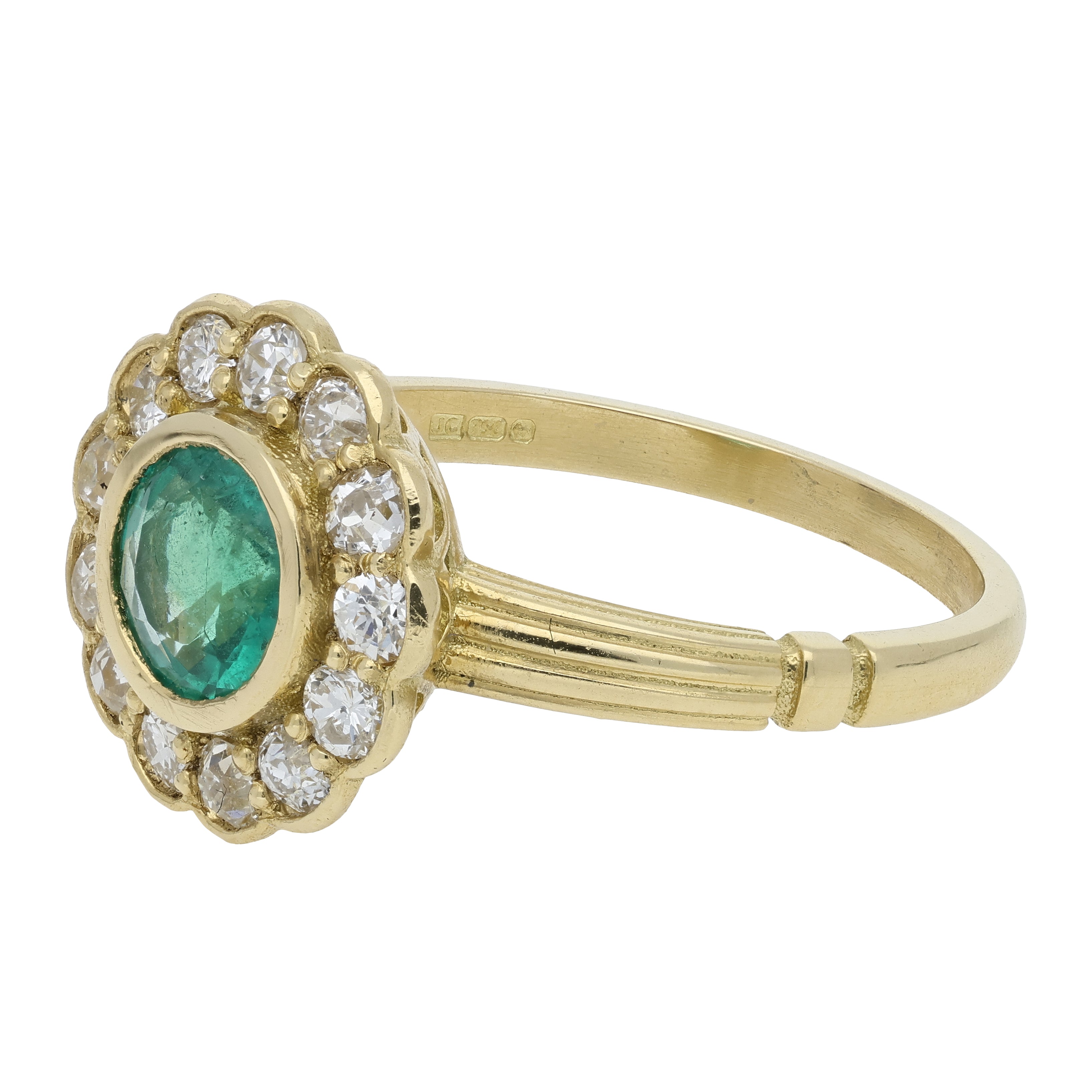This beautiful vintage ring features a vibrant round cut emerald, securely bezel set at its centre. The emerald is surrounded by a cluster of thirteen round cut diamonds which are bezel set creating a lovely scalloped edge. The shoulders of the ring are accented with linear engraving which lead into a solid yellow gold band.