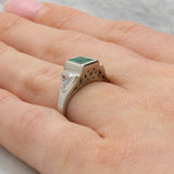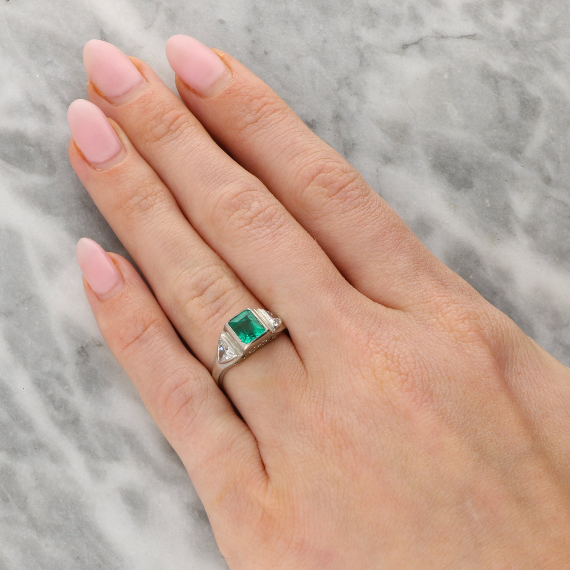 The ring is predominately set with an estimated 1.50ct vibrant emerald cut emerald, securely encased in a polished platinum rub over setting. The emerald is sided by two sparkly trilliant cut diamonds, similarly set and encased is a platinum rub over setting. The contrast of the platinum against the vibrant emerald is superb and allows the stone to pop nicely on the hand.