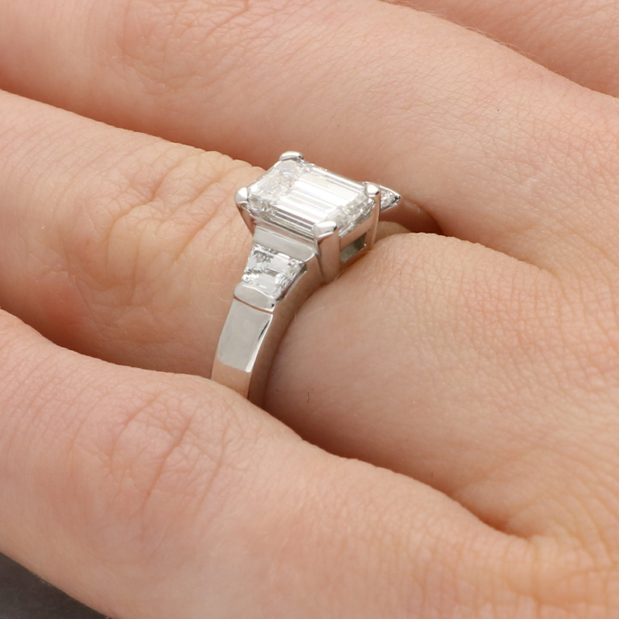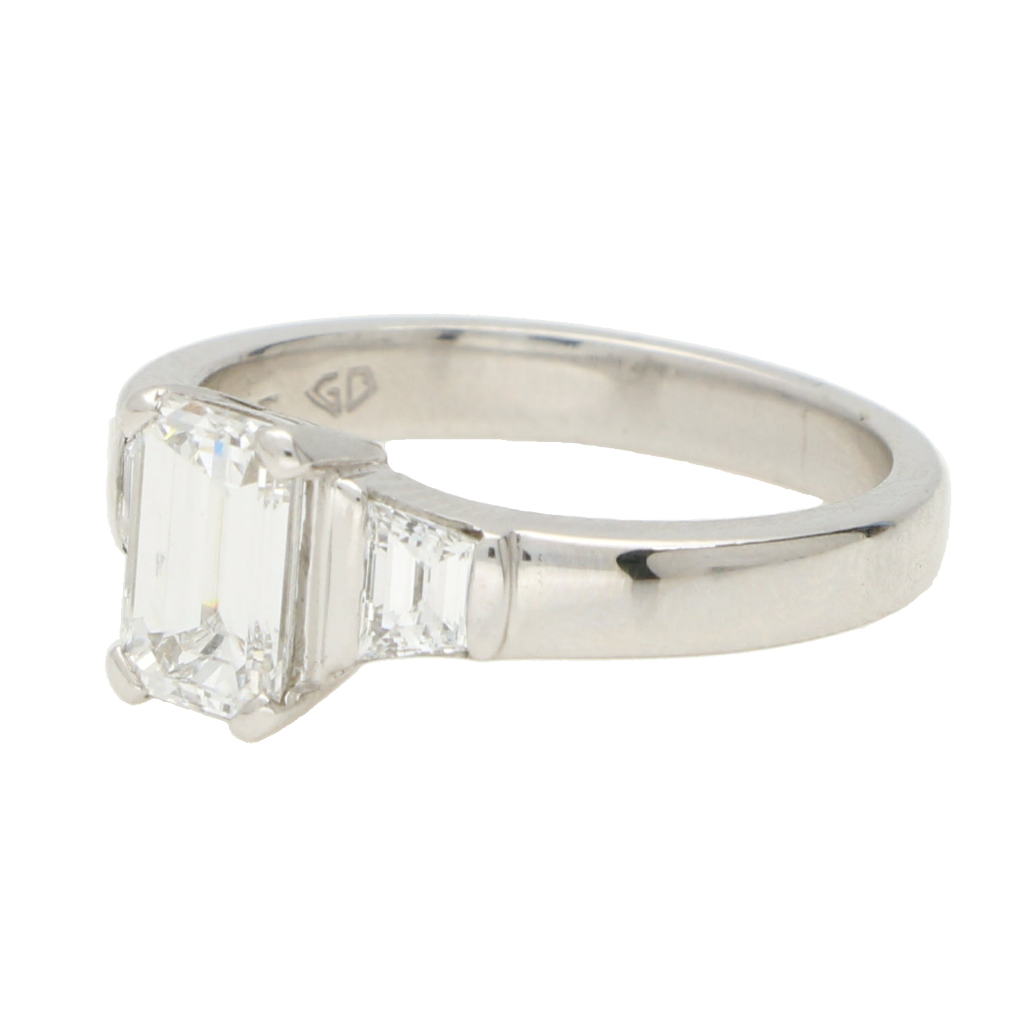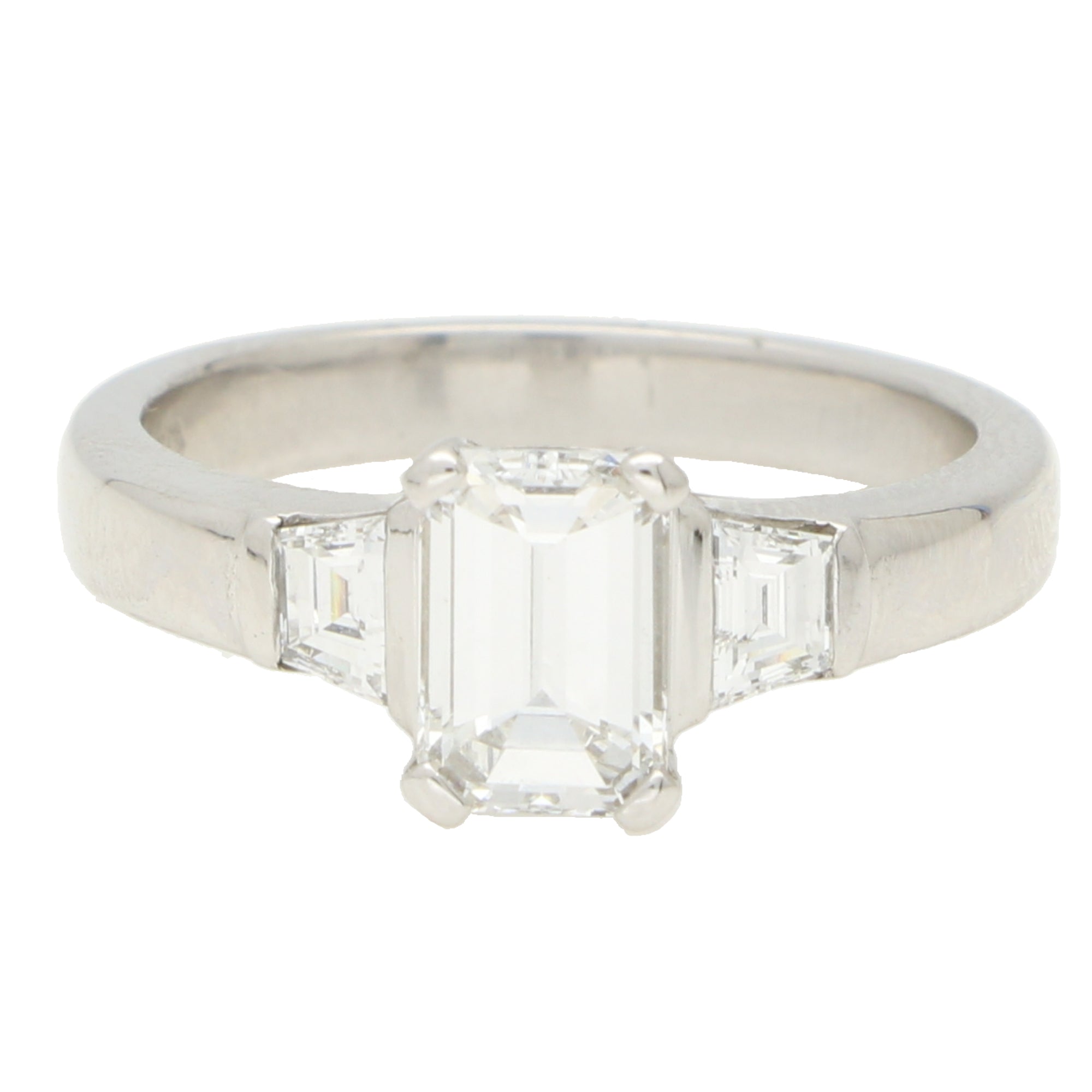 The ring is predominately set with a sparkly 1.15 carat emerald cut diamond, which is securely four claw set to centre. The emerald cut is then sided by two perfectly matched trapezoid cut diamonds, both set in a bezel setting.