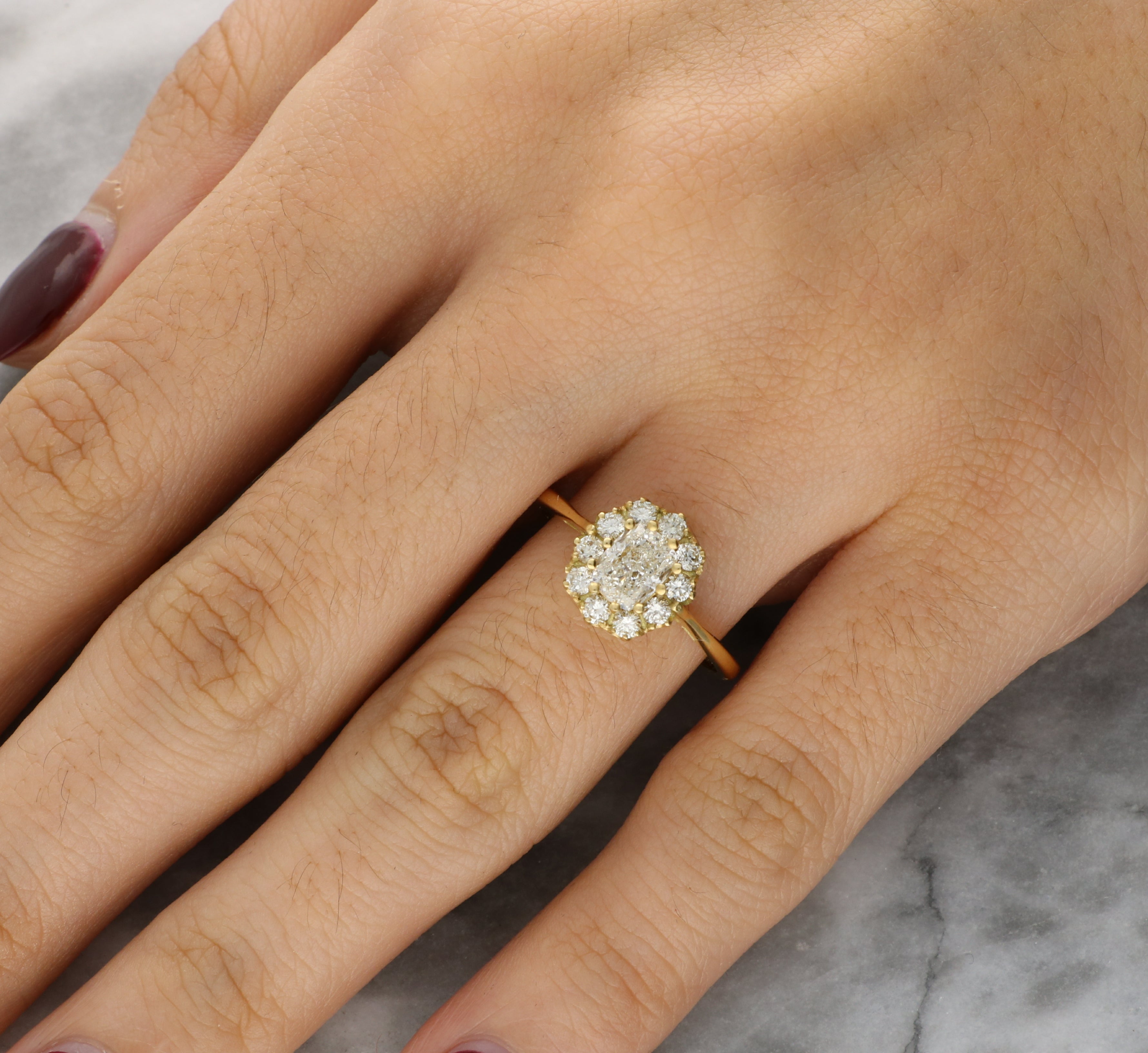 This 18ct yellow gold ring features a cushion cut diamond at its centre, held securely in a ten claw setting. Surrounding the diamond is a halo of round brilliant cut diamonds, each individually claw set. The cluster sits on a tapered 18ct yellow gold band.