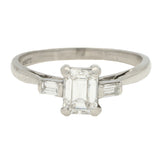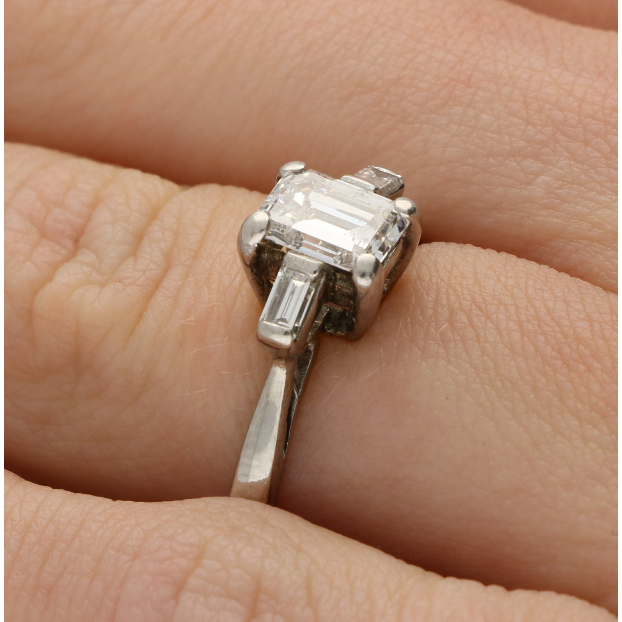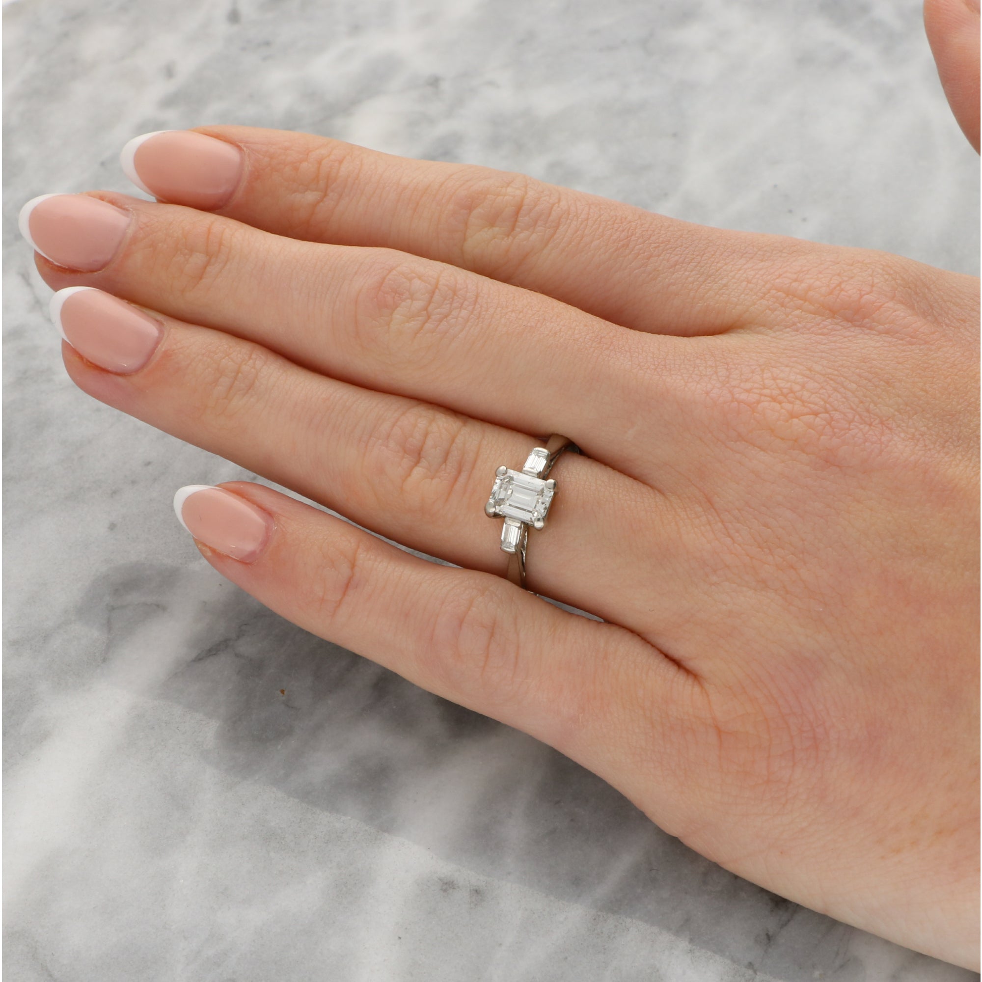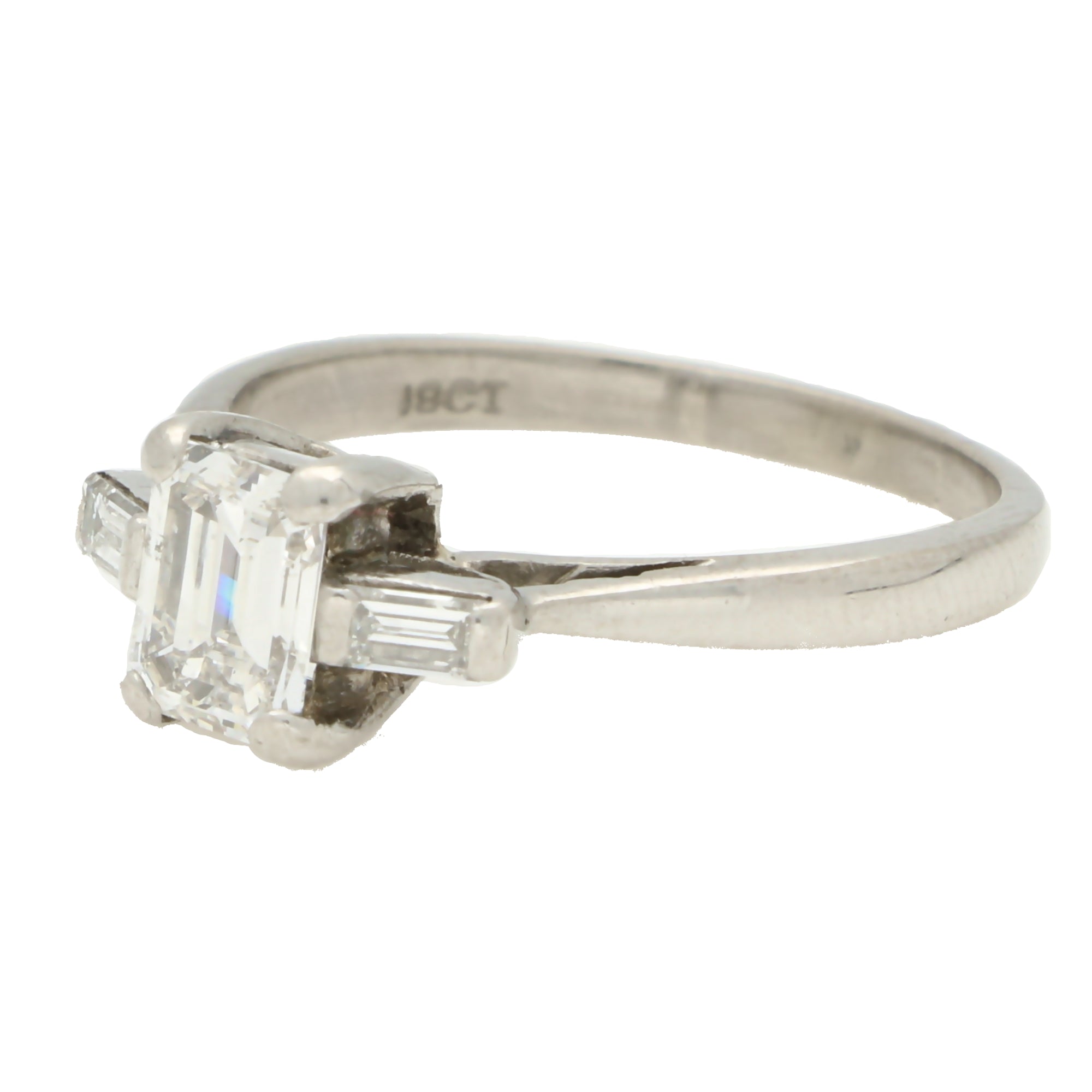 The ring is centrally set with a 0.80 carat emerald cut diamond, which is securely four claw set. The diamond is then sided by two perfectly matched baguette cut diamonds, leading to a solid 18k white gold band.