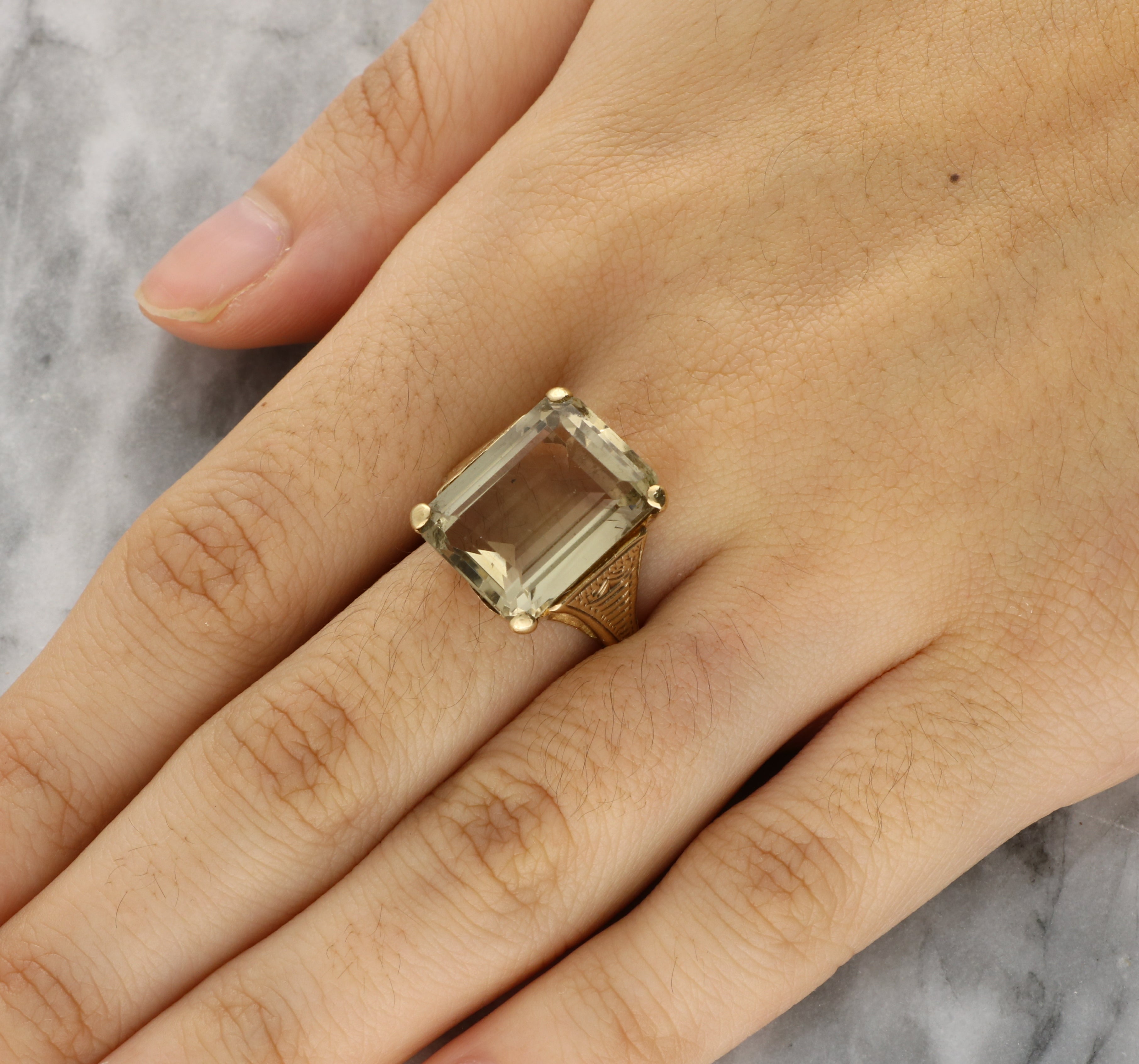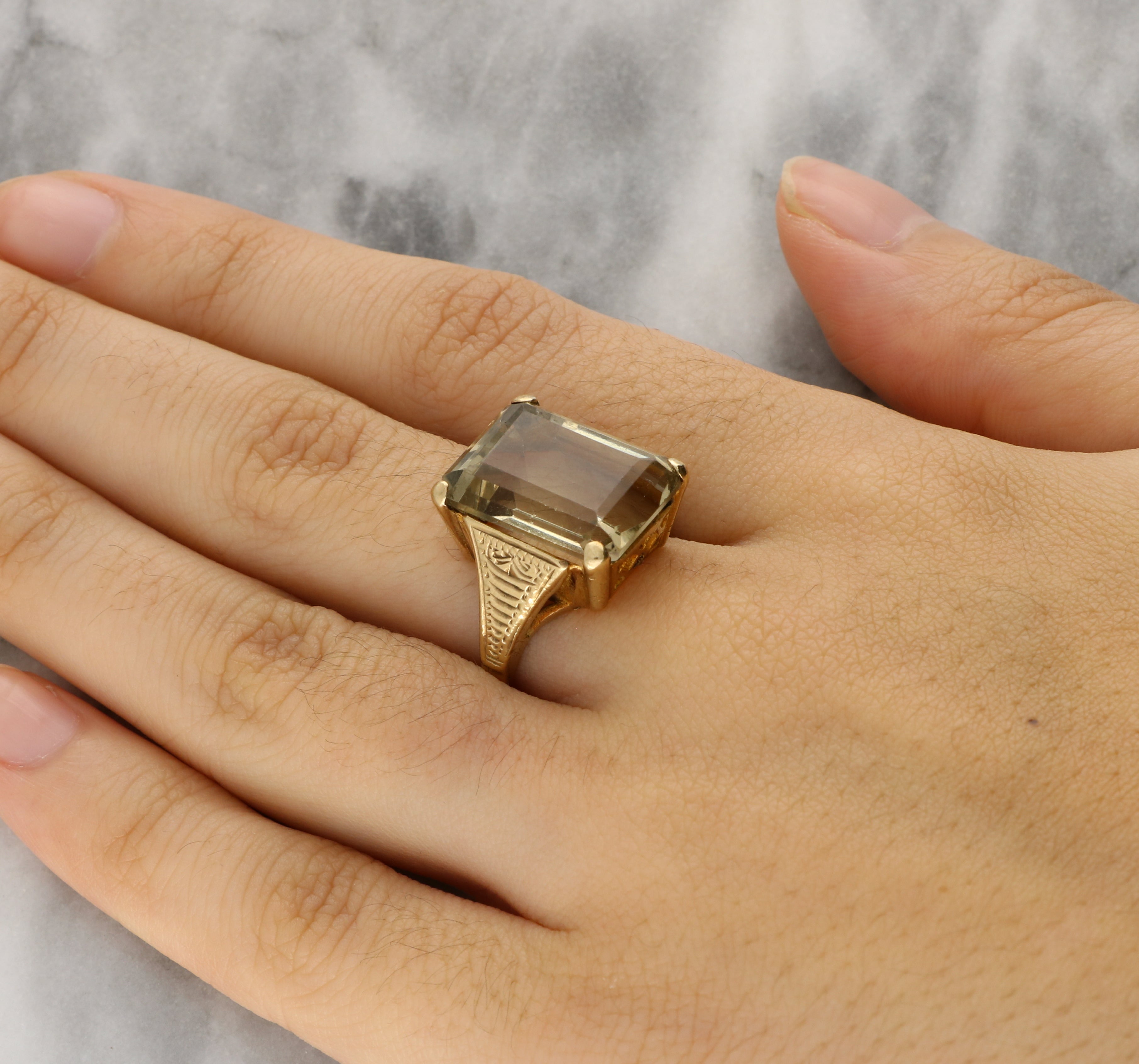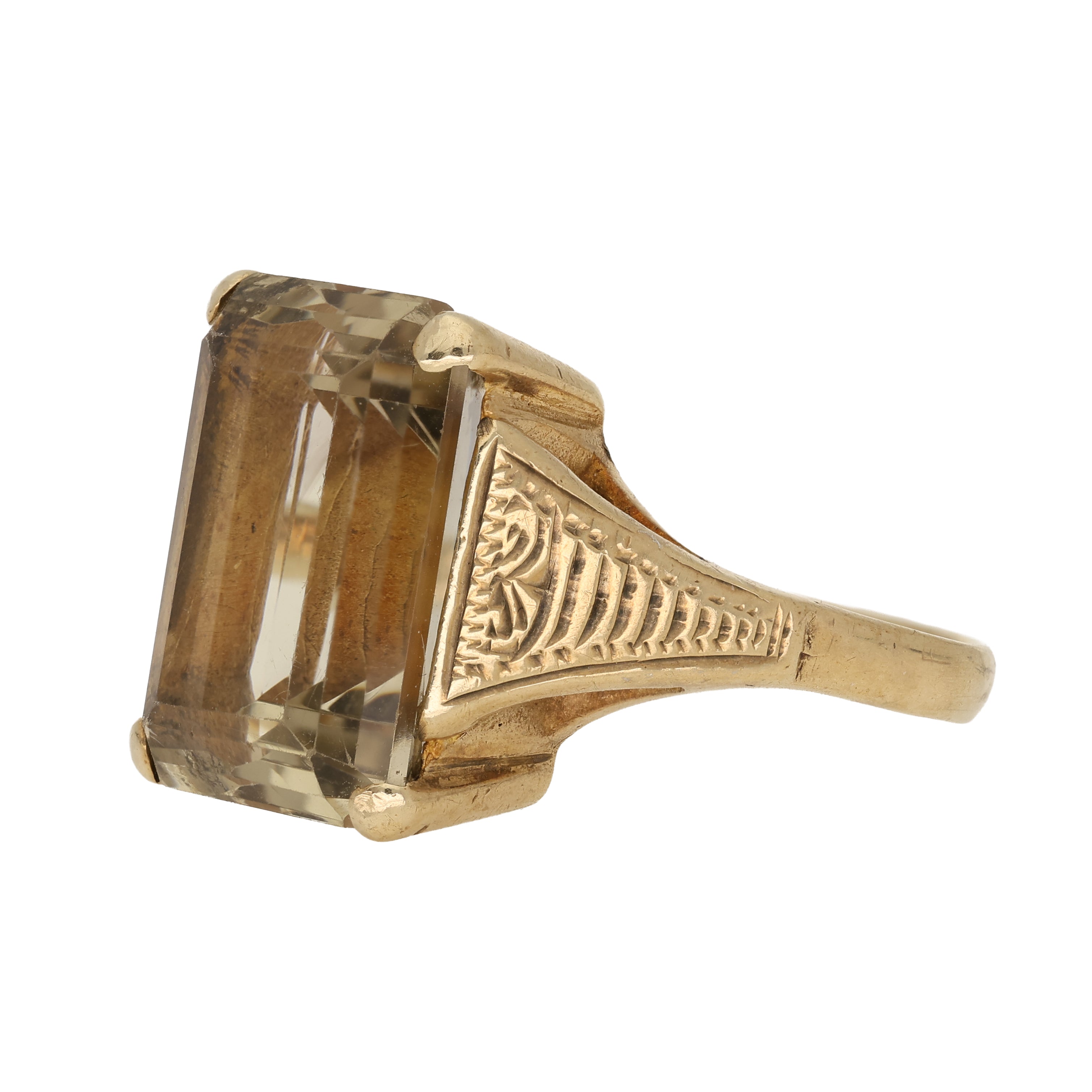 The shoulders are decorated with finely engraved motifs, adding depth and craftsmanship to the ring. This style of detailed shoulder engraving is typical of late Victorian and Edwardian jewellery, periods that celebrated ornamental metalwork and strong, sculptural forms. Smoky quartz was particularly favoured in the late 19th and early 20th centuries, valued for its earthy colour and durability.