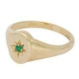 This lovely signet ring is crafted in polished yellow gold and features a subtle star-set emerald. The small round emerald is set flush into the face, with engraved star detailing that draws the eye and adds a classic touch of sparkle.
