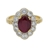 This eye catching vintage ring features a vibrant marquise cut yellow diamond, securely held in place by four claws. Surrounding the central stone is a cluster of ten round brilliant cut diamonds that enhance the warm tone of the yellow diamond. Each shoulder is further detailed with three rows of small round diamonds, adding extra sparkle and visual interest. The head of the ring leads into a solid 18ct yellow gold band.
