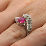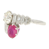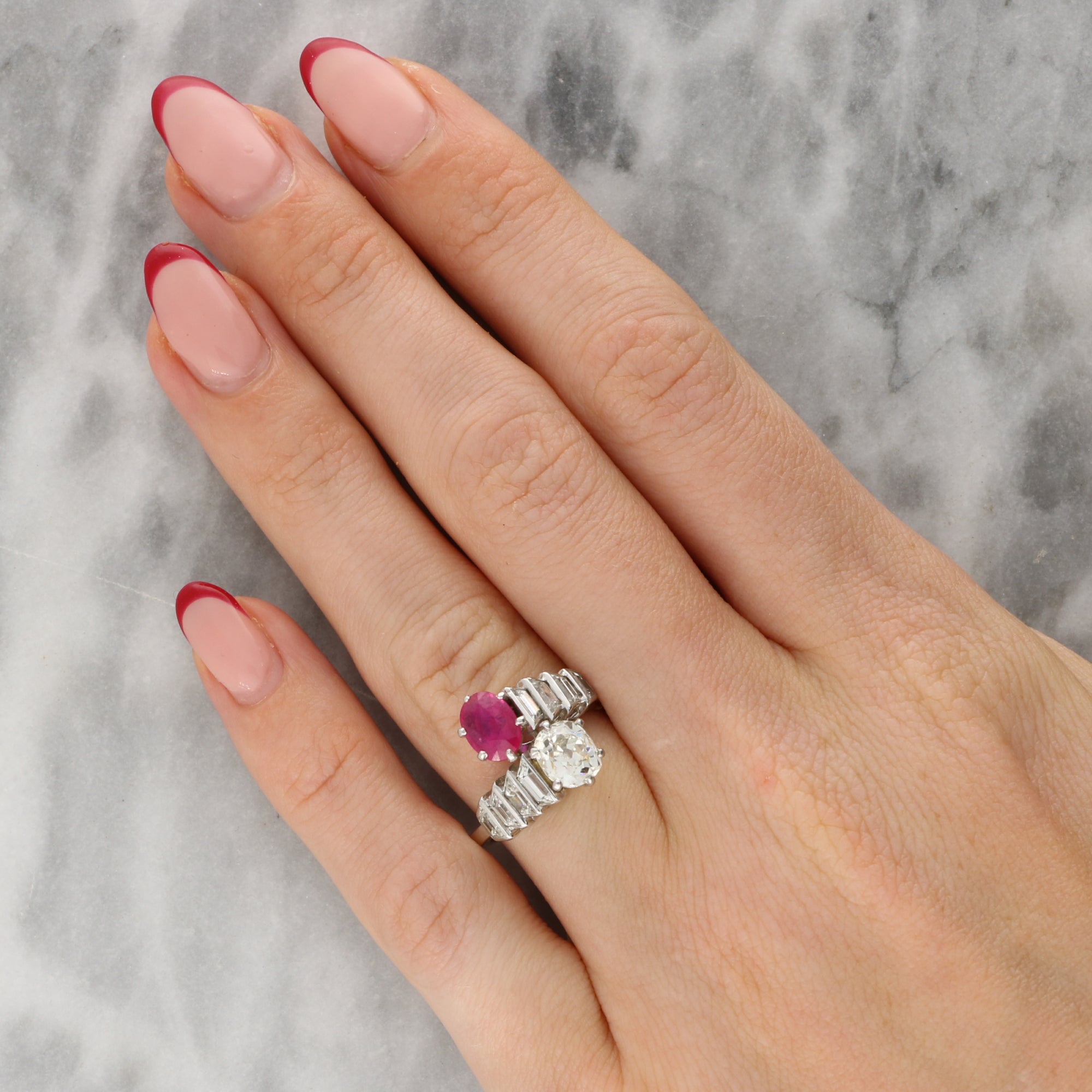 The ring features an oval cut pinkish-red ruby and a old cushion cut diamond; classically set in a toi-et-moi design. Each stone is six claw set and sided by graduating trapezoid cut diamonds. The head of the ring leads to a solid platinum band.