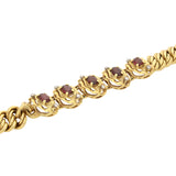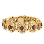 This striking bracelet is crafted in rich 18K yellow gold and features a series of oval garnets, each securely claw-set within sculptural, textured gold surrounds. The deep red tones of the garnets create a beautiful warmth, perfectly complemented by the golden setting.
