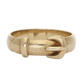 A classic and symbolic vintage buckle ring, crafted in warm 9ct yellow gold. Designed to resemble a traditional belt complete with buckle, loop and strap tip, the piece carries lovely sculptural detail despite its understated size.