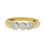 The piece is centrally set with three round-cut diamonds, securely held in a rubover setting with open sections that create an elegant swirl design. The head of the ring flows into a solid 18k yellow gold band.