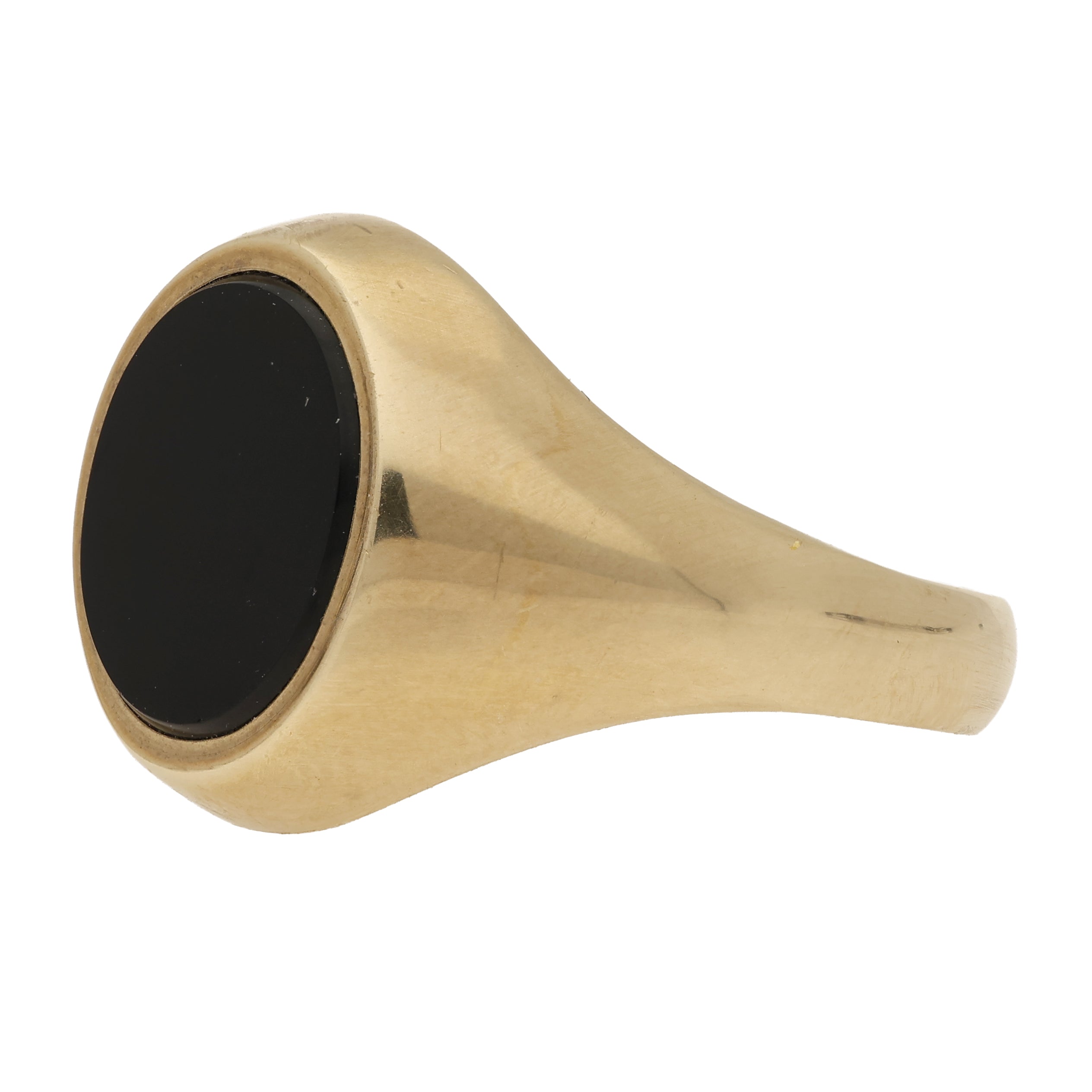 This elegant signet ring is crafted in 9K yellow gold and set with a smooth, oval black onyx at its centre. The onyx displays a rich, jet-black colour with a high-polish finish, lending the ring a bold yet understated presence.
