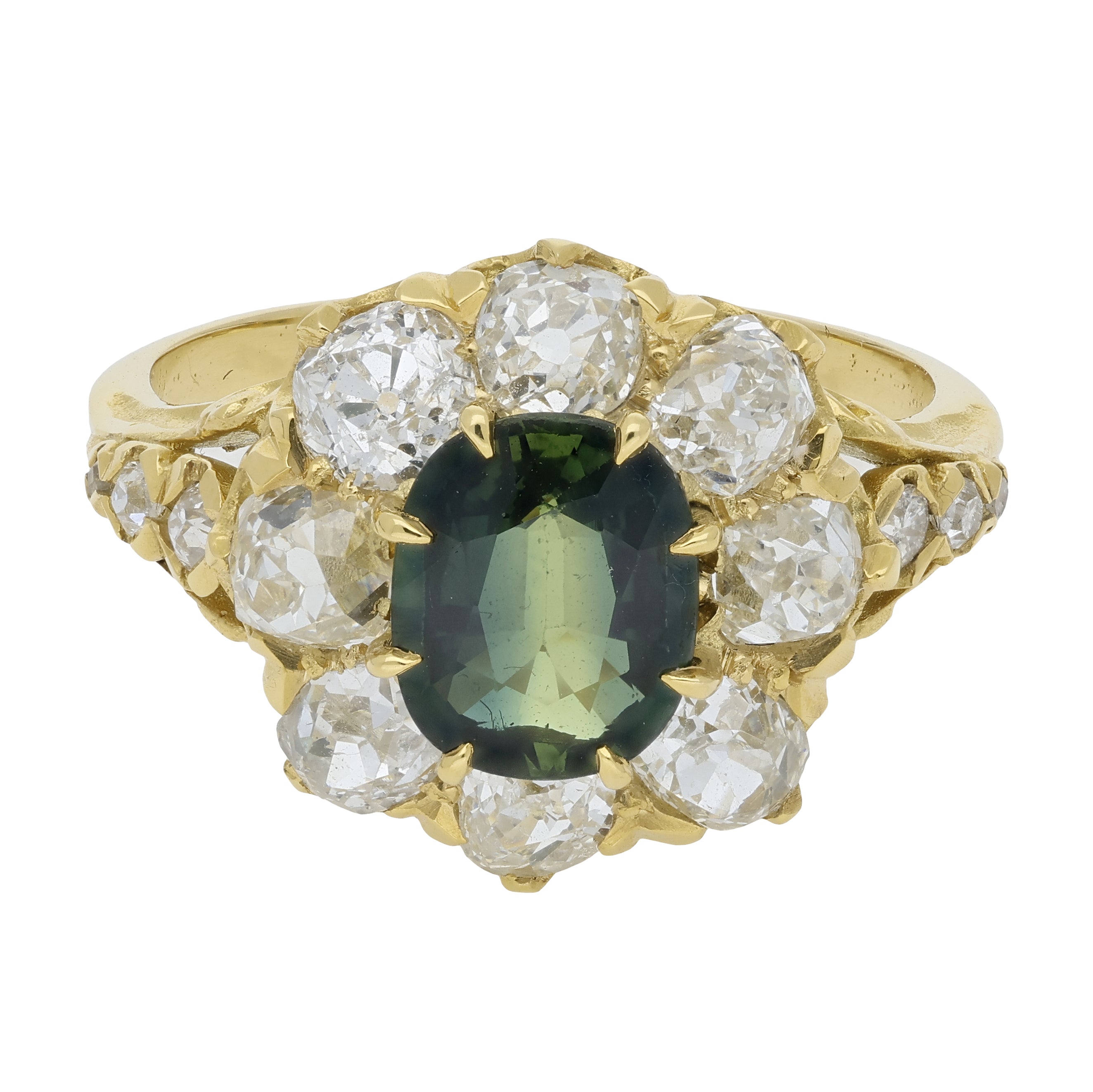 The piece is centrally set with a warm green sapphire, surrounded by a cluster of eight round old cut diamonds. The shoulders of the ring are further set with graduating in size diamonds.