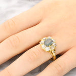 An elegant example of classic cluster design, this ring makes a wonderful choice for an engagement ring or a timeless statement piece. The green sapphire adds a lovely unique touch to a classic ring design.