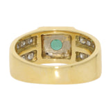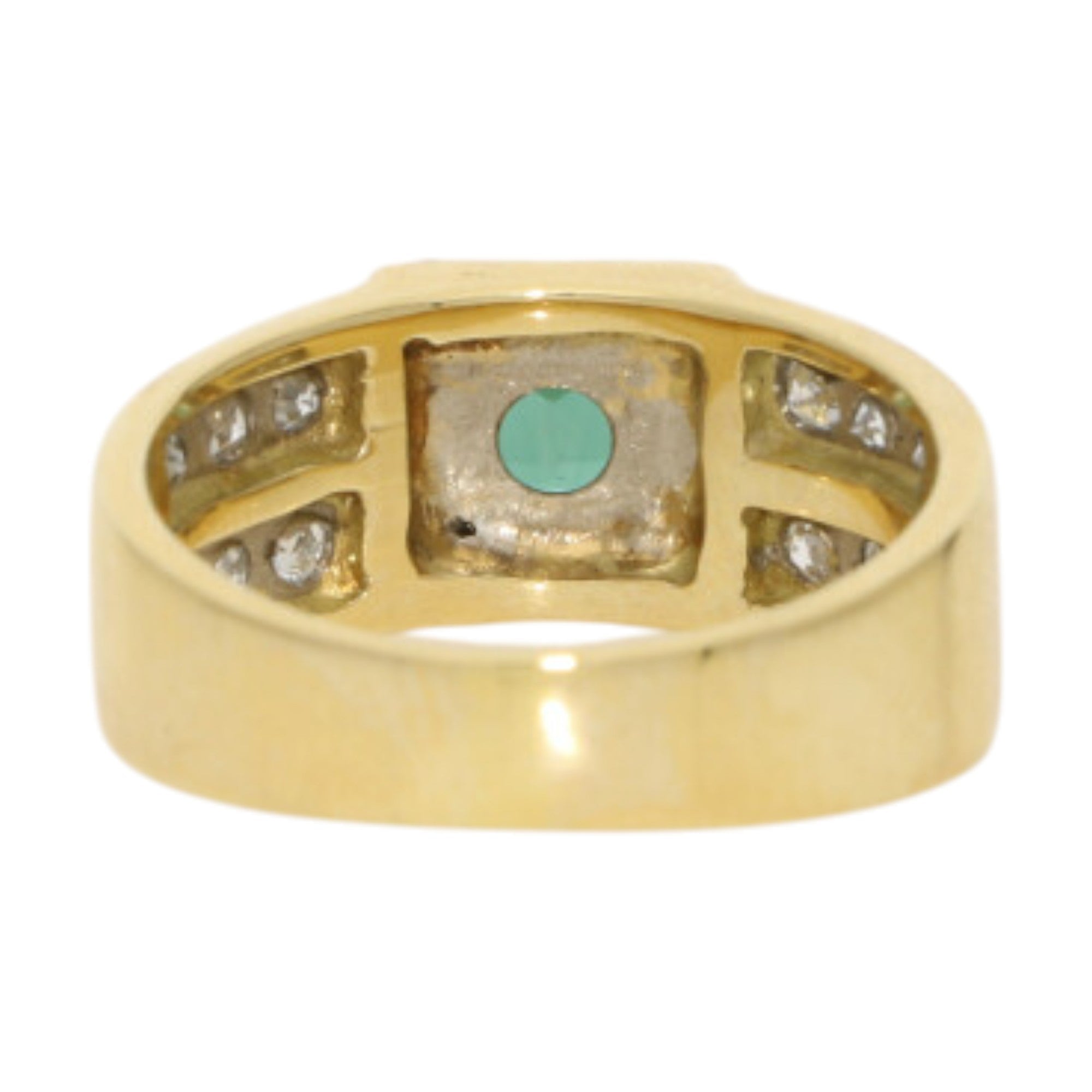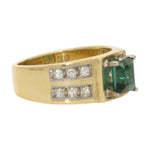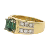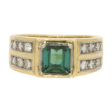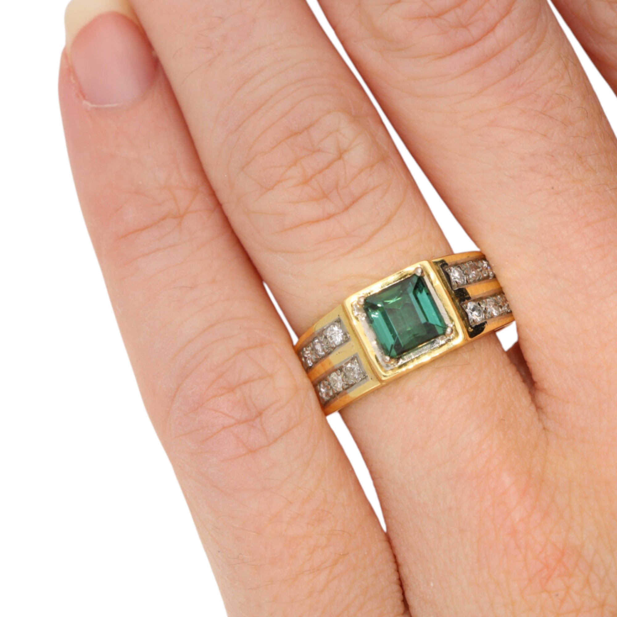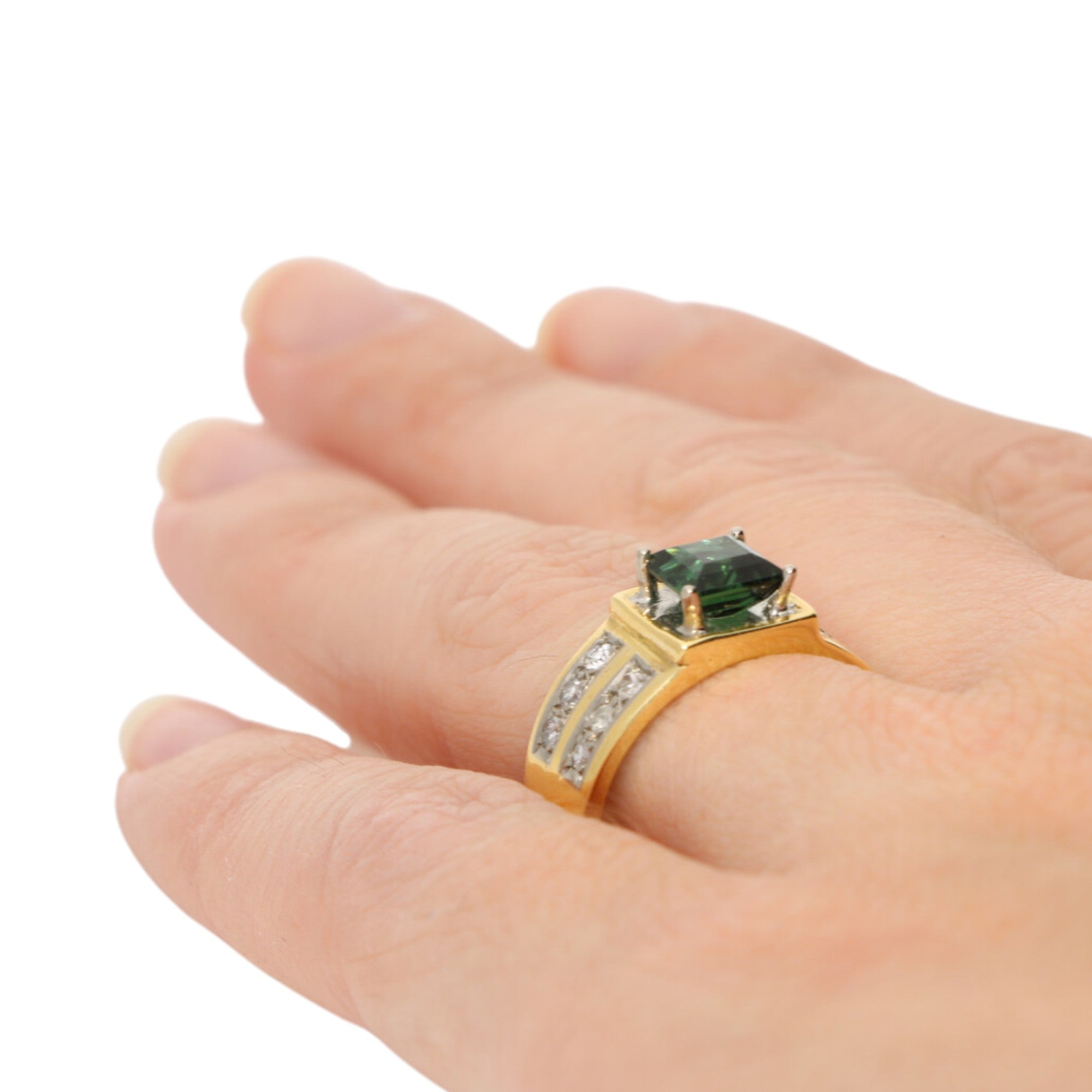 A statement vintage square-cut green tourmaline and round brilliant diamond ring set in 18k yellow gold.