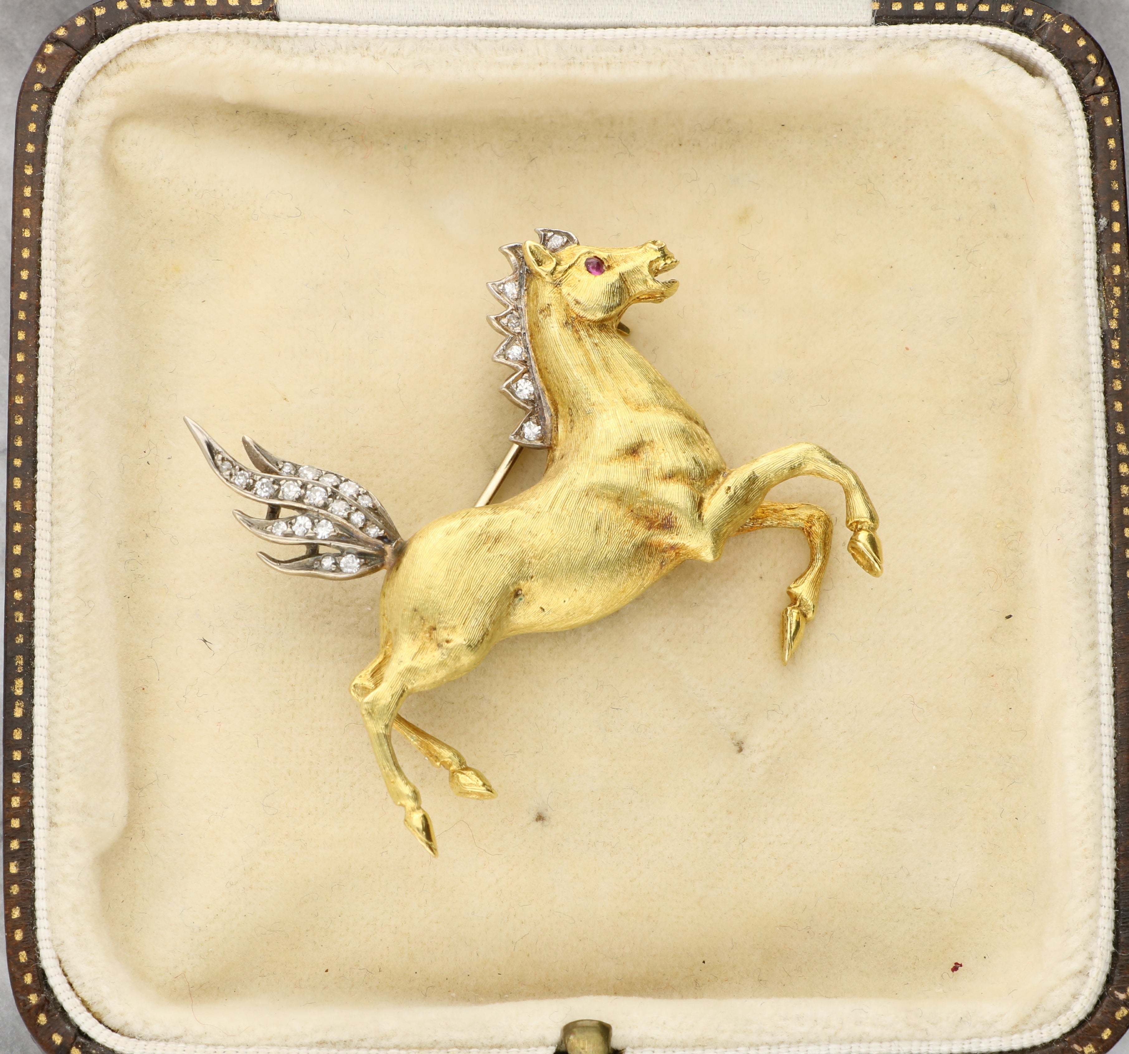 The wings and mane are highlighted with old-cut diamonds, creating a shimmering contrast against the matte gold surface. A small ruby cabochon forms the eye, adding a vivid touch of colour.