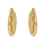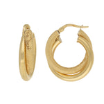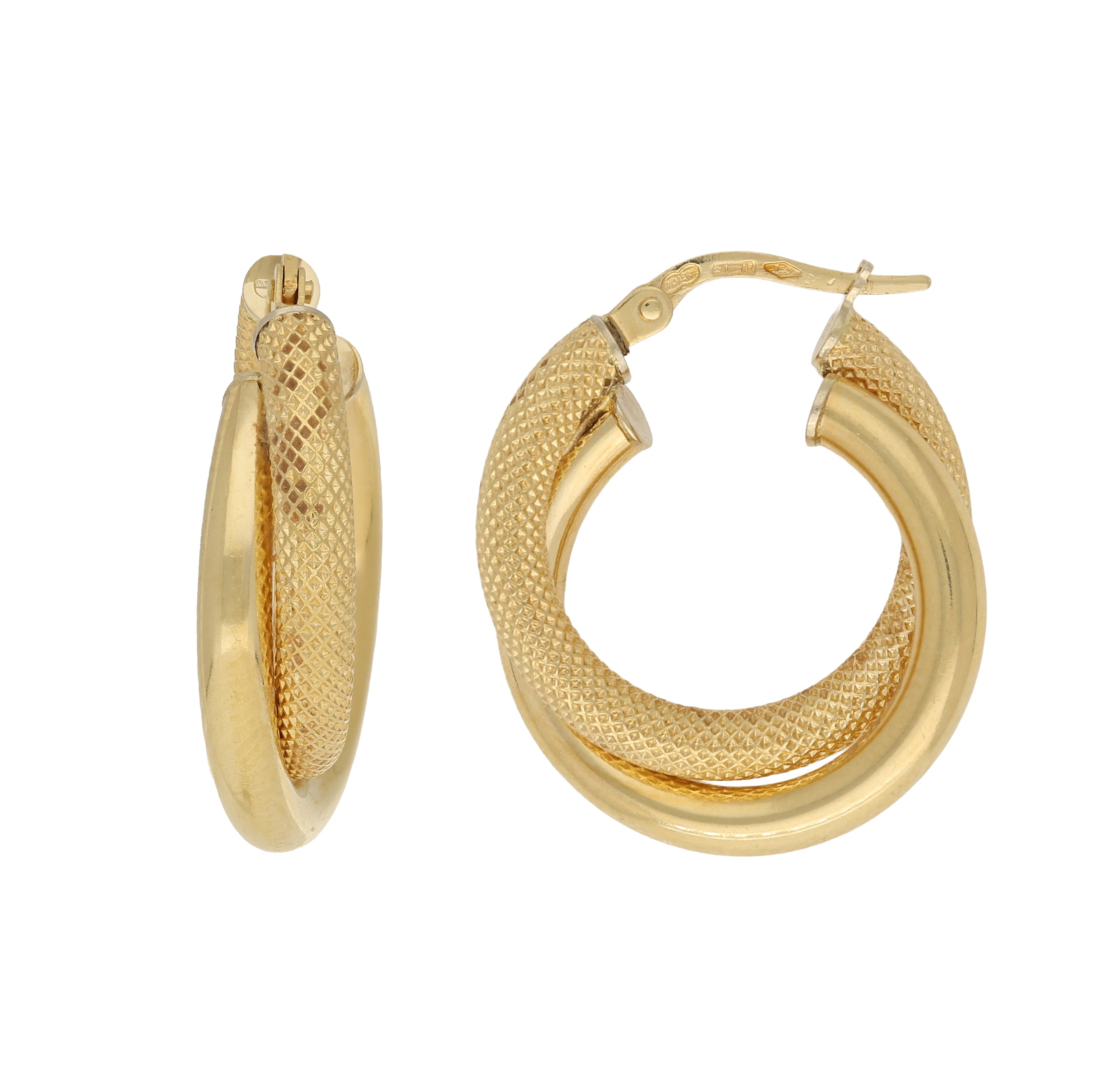 These hoops have an overlapping double hoop design that catches the light beautifully. Made in 18ct gold, one of the hoops has a smooth polished finish whilst the other hoop has a gorgeous snake-like pattern. It is finished with secure hinged fastenings for comfortable everyday wear.