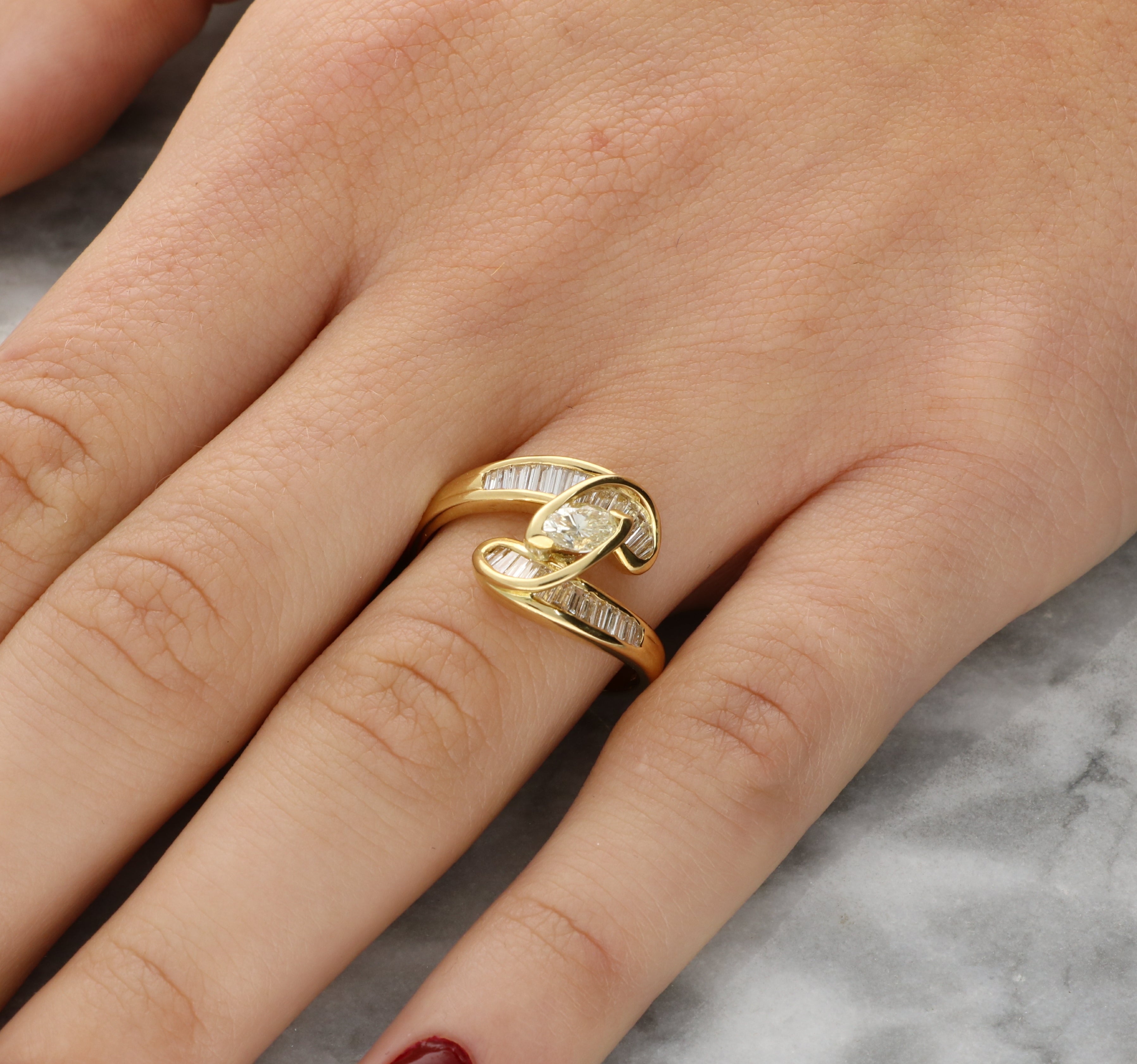 The ring features a marquise cut diamond set at the centre. The diamond is held within a curved, open setting that forms the focal point of the design. Sweeping around the central stone are two rows of tapered baguette cut diamonds, following the swirl shape of the ring. The head of the ring leads into a polished yellow gold band.