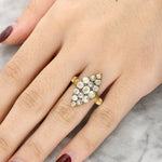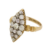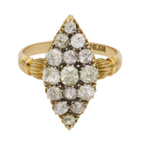 This ring is crafted in yellow gold and features a navette shaped cluster of old cut diamonds arranged in an elongated marquise form. The diamonds display a soft, lively sparkle characteristic of antique cuts, creating a bright focal point.