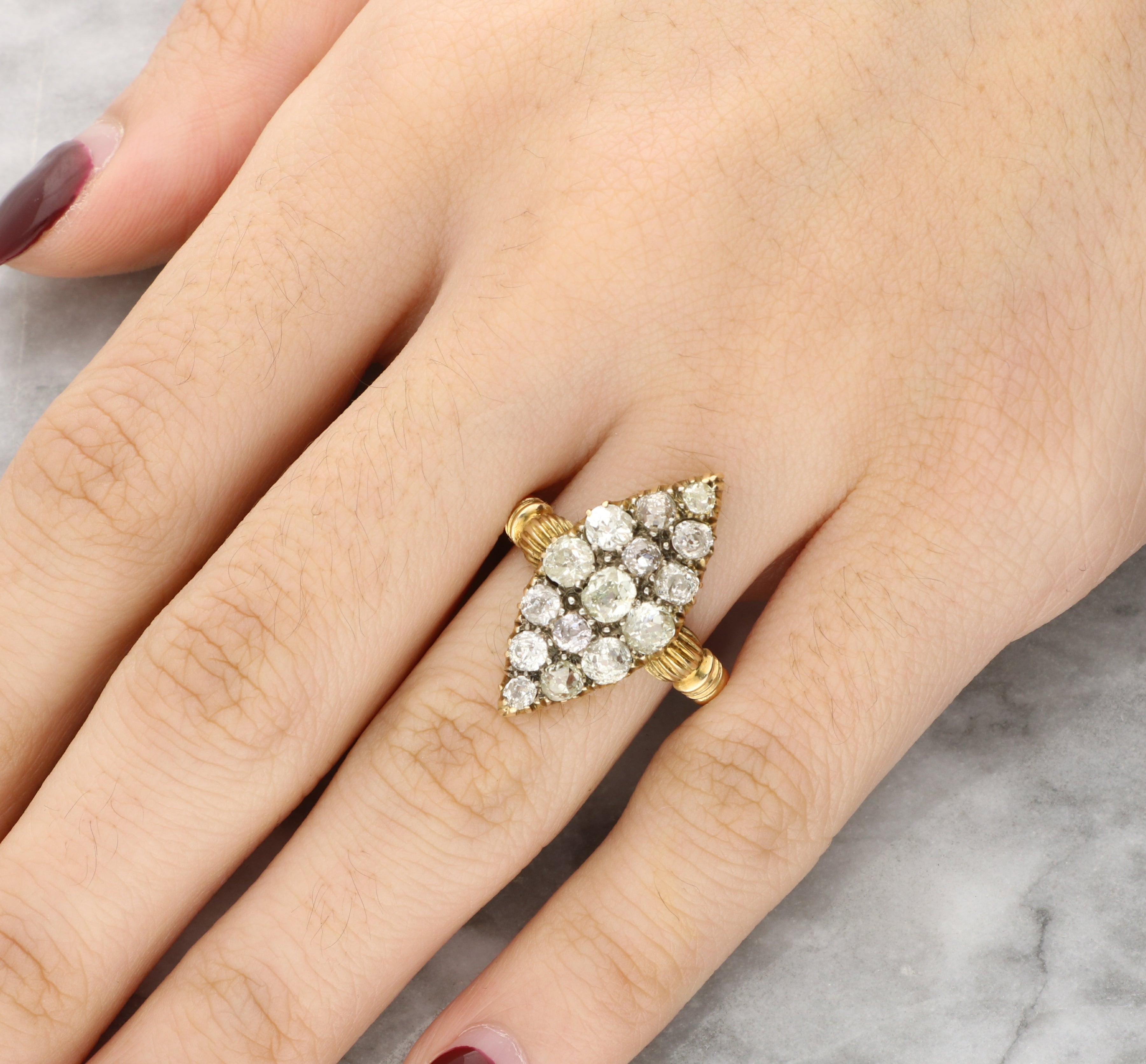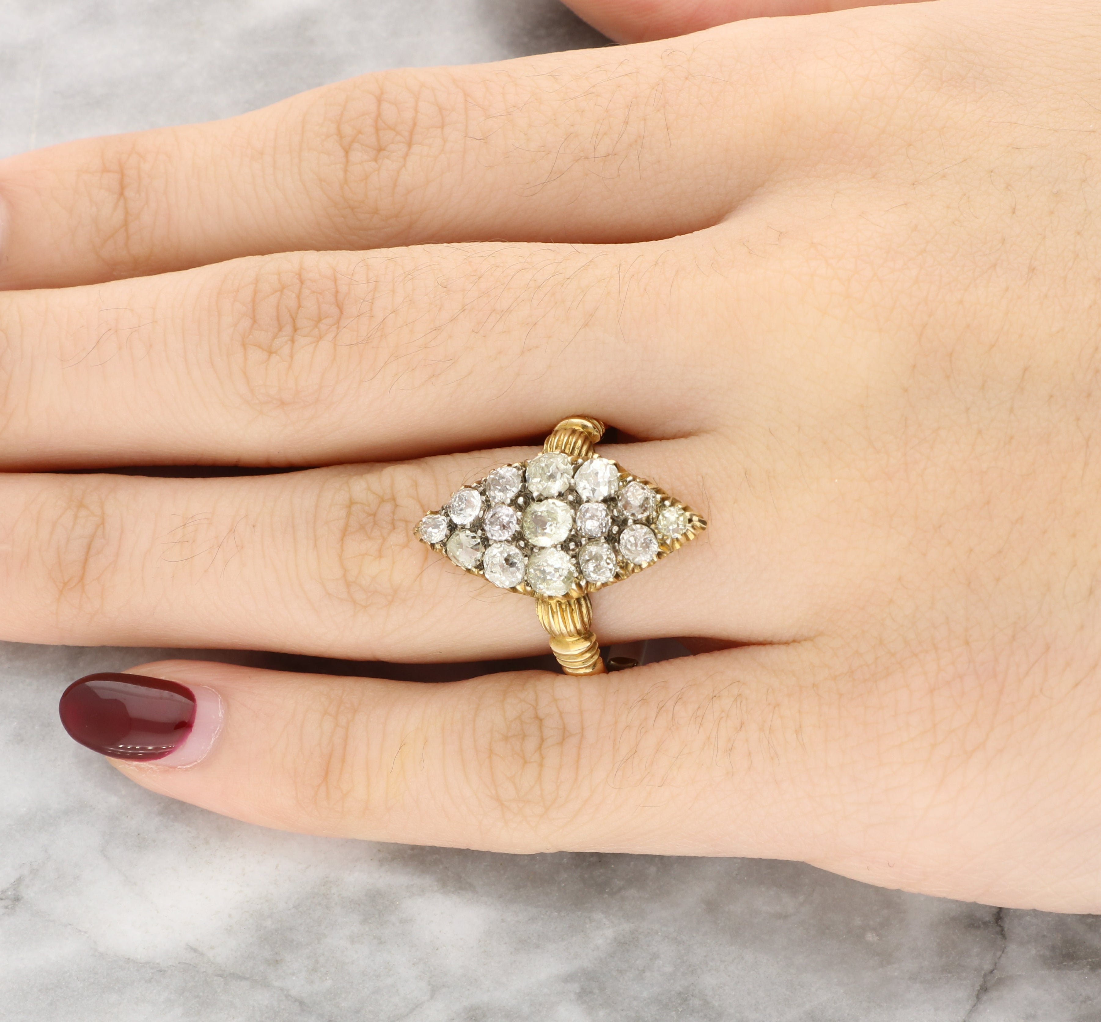 This diamond navette cluster ring is a timeless antique piece, combining delicate craftsmanship with classic elegance.