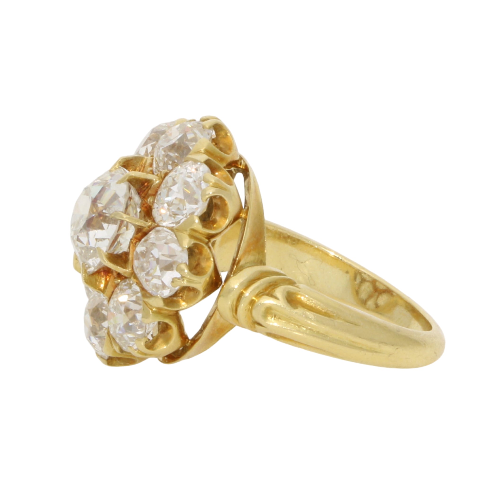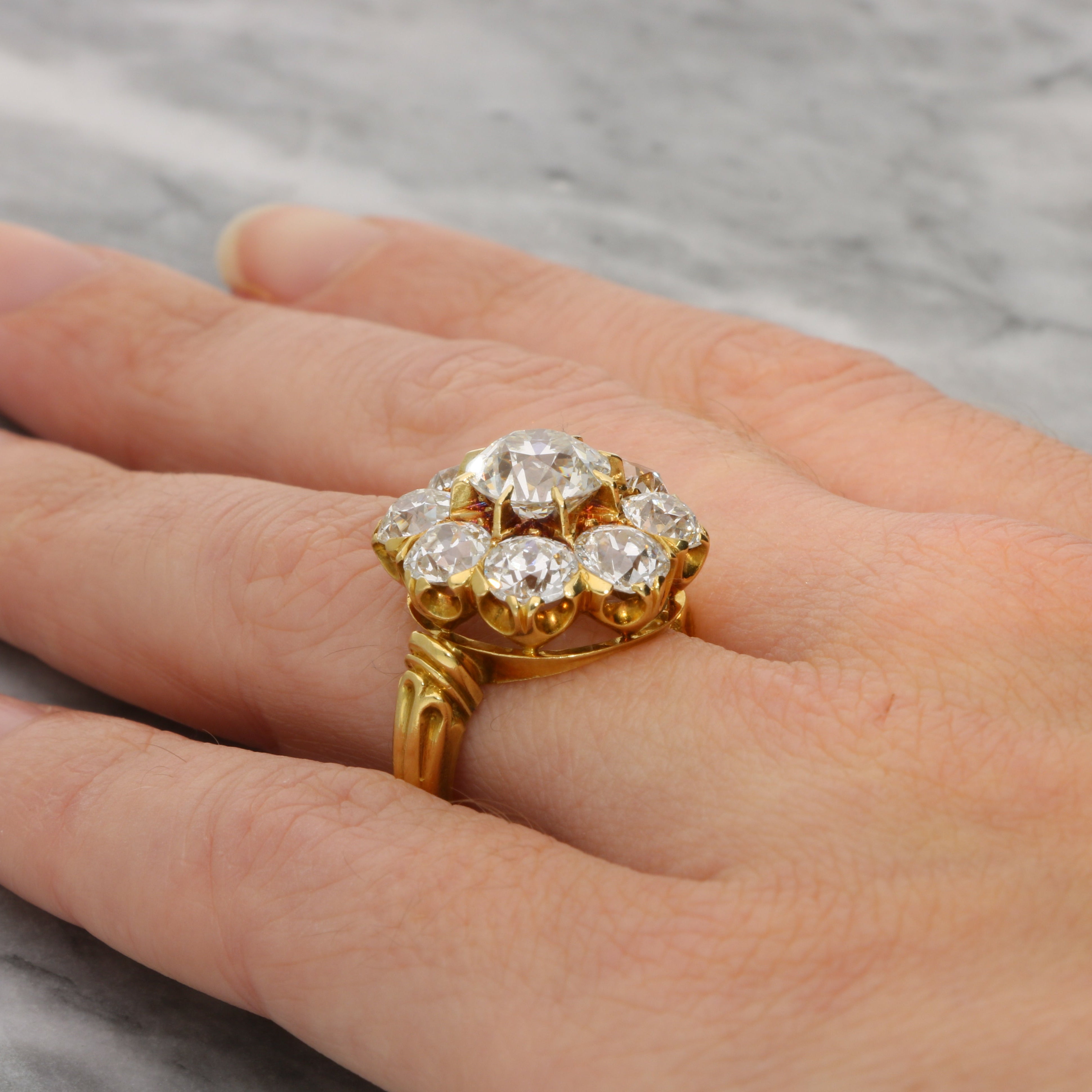 The piece is centrally set with a sparkly 2.30 carat old cut diamond which is eight claw set securely. The central stone is then surrounded by a cluster of eight further old cut diamonds which flow down to carved shoulders.