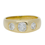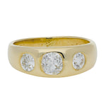 The ring is set with three round old mine cut diamonds, bezel set across the front of a polished 14ct yellow gold band. The central diamond is slightly bigger, with a diamond set to either side, creating a lovely well-proportioned design.